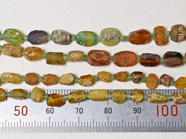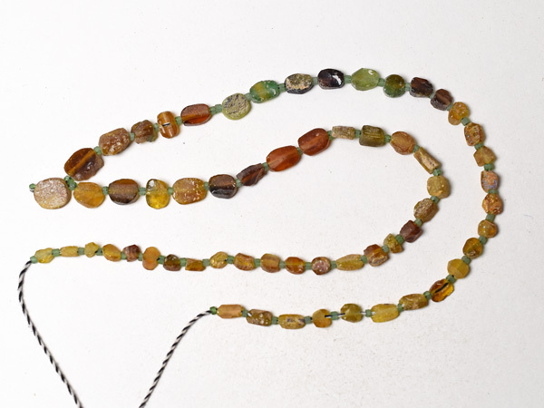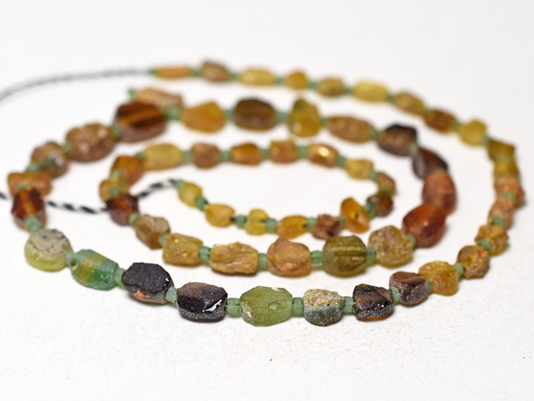 約2000年前の古代ローマンガラス器やバングル等の残欠片を、現代にカット、研磨、穿孔した、小さな円形扁平型や四角管型のガラスビーズ一連です。金に近い色目で豪勢な雰囲気を持つビーズです。一部緑色の粒を含みます。古代ガラスの素晴らしい色目と味を生かしたアクセサリ製作用におススメです。いくつかの粒に神秘的に輝く銀化(または金化)が見られます。一連中5粒の孔が露出していますが、全体的には状態は概ね良好です。繋ぎの小さな緑色のビーズは現代のガラスビーズです。