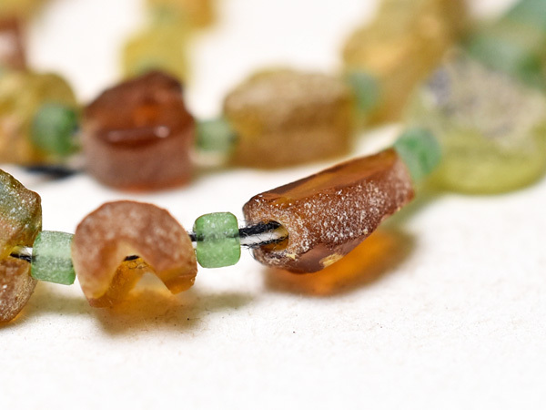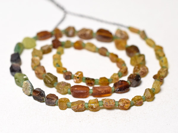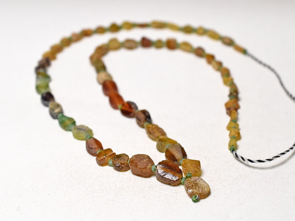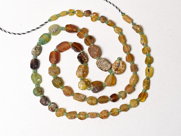 約2000年前の古代ローマンガラス器やバングル等の残欠片を、現代にカット、研磨、穿孔した、小さな円形扁平型や四角管型のガラスビーズ一連です。金に近い色目で豪勢な雰囲気を持つビーズです。一部緑色の粒を含みます。古代ガラスの素晴らしい色目と味を生かしたアクセサリ製作用におススメです。いくつかの粒に神秘的に輝く銀化(または金化)が見られます。一連中5粒の孔が露出していますが、全体的には状態は概ね良好です。繋ぎの小さな緑色のビーズは現代のガラスビーズです。