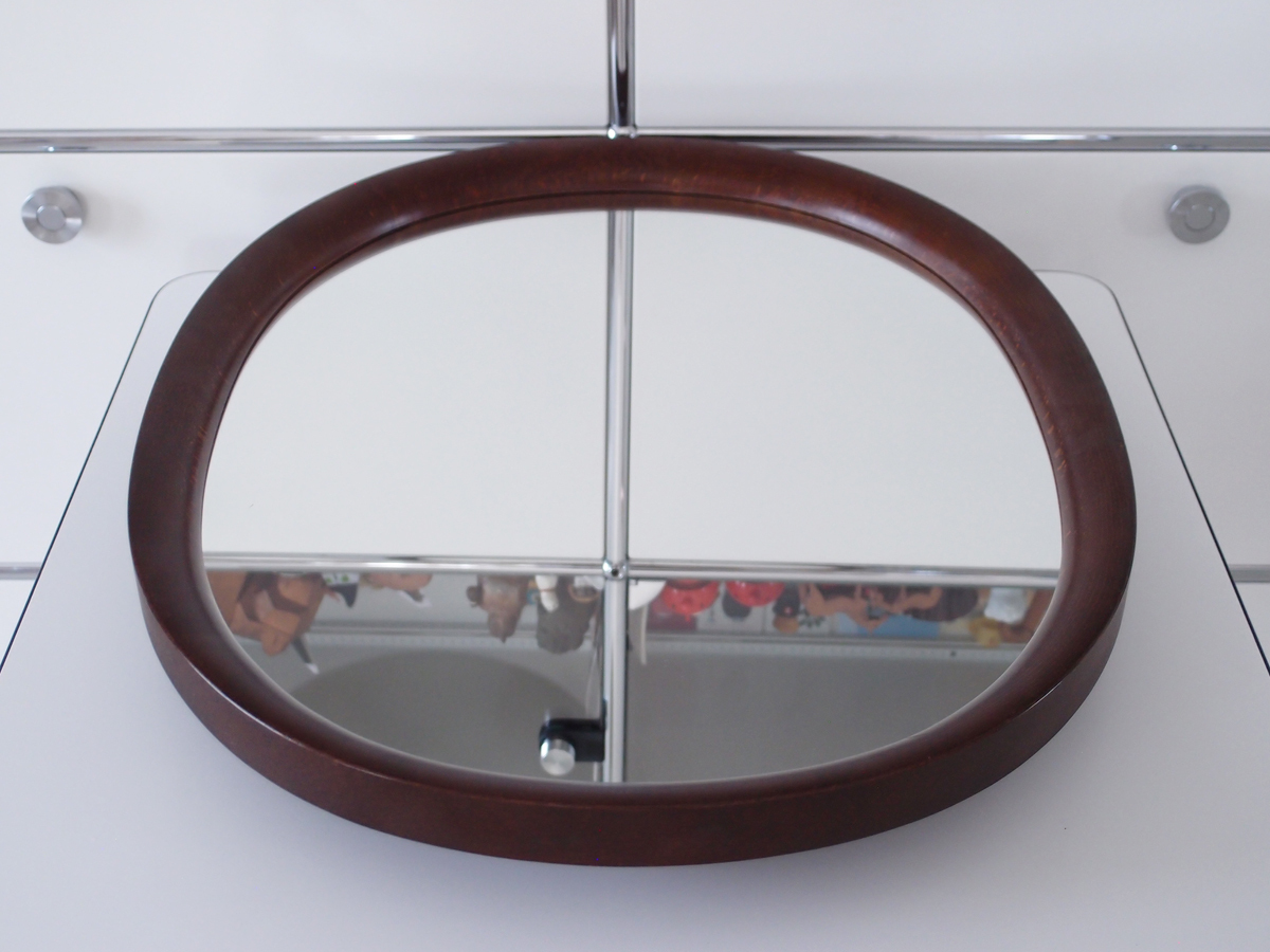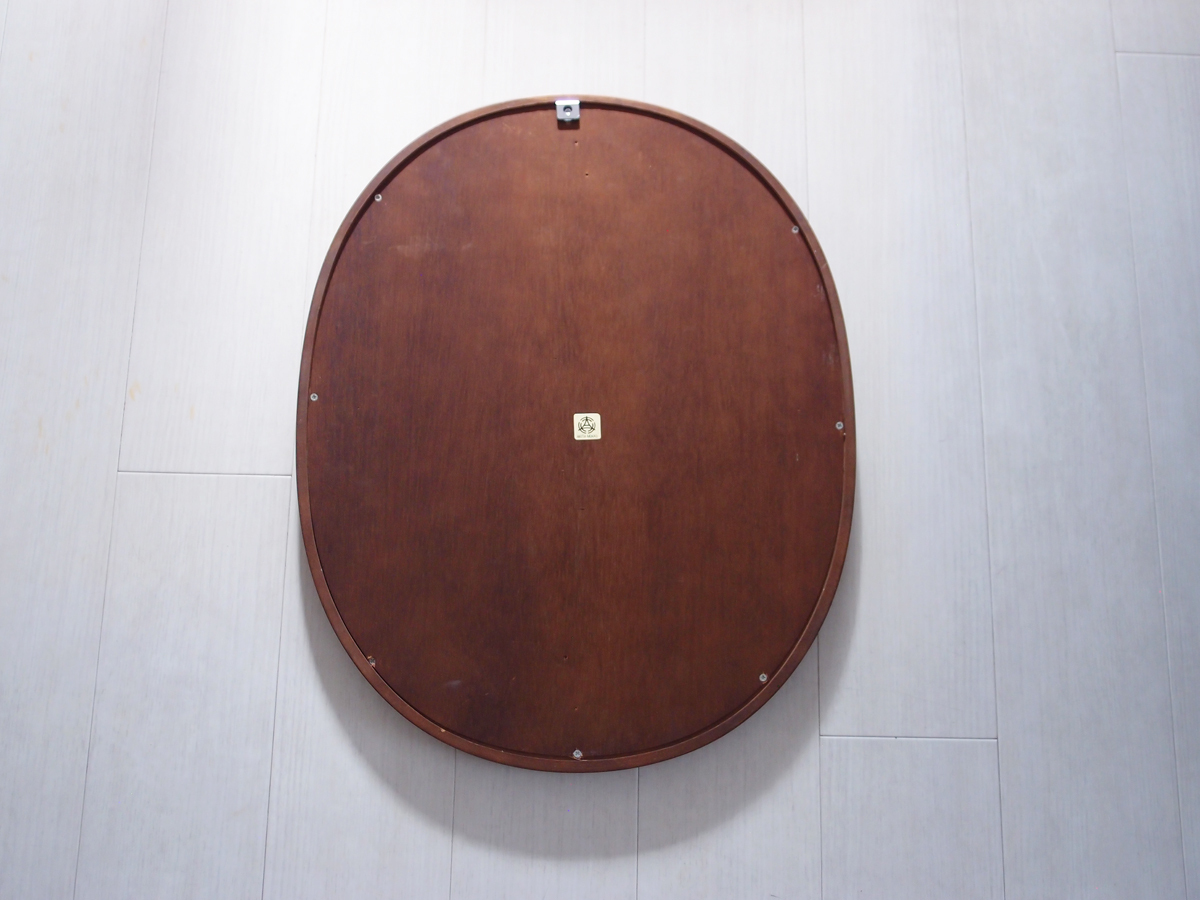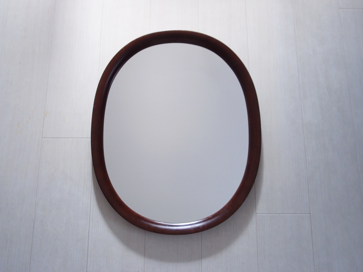 秋田木工 柳宗理 曲木鏡 小判中 古代色です。サイズ:47.5×59.5cm。小キズはございますが、きれいな状態です。現状ノークレームにてお願い致します。