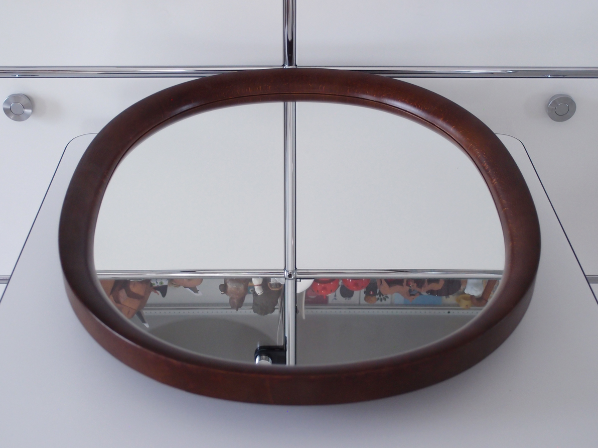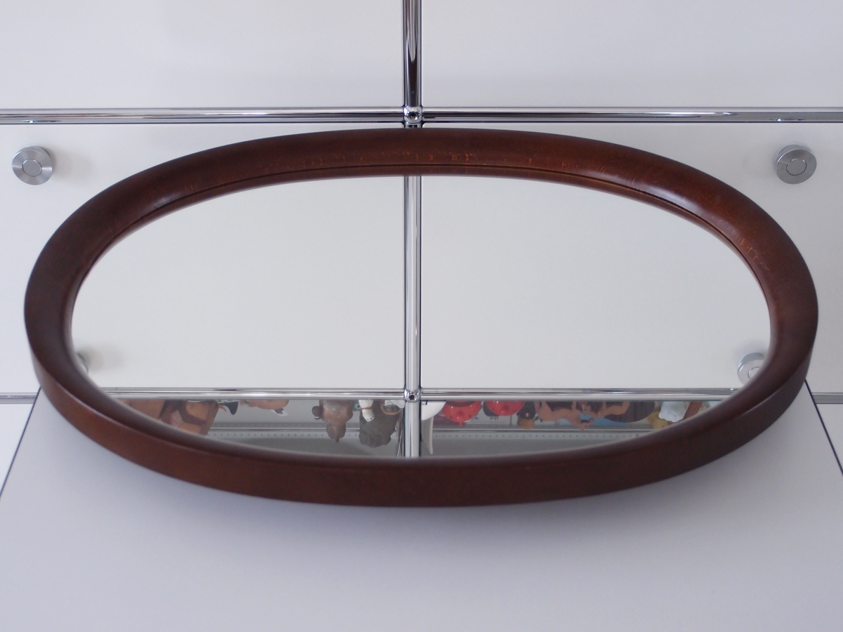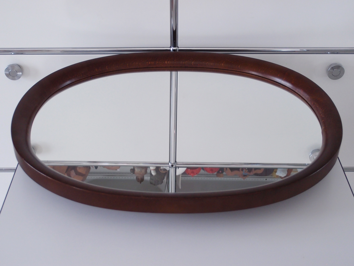 秋田木工 柳宗理 曲木鏡 小判中 古代色です。サイズ:47.5×59.5cm。小キズはございますが、きれいな状態です。現状ノークレームにてお願い致します。