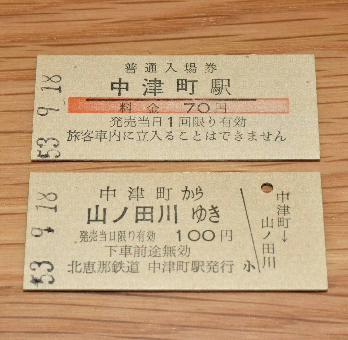 北恵那鉄道 中津町駅発行 2枚 入場券・乗車券 廃止最終日 です。古いものなので、経年劣化によるヤケ,シミ,汚れ,折れシワ等見られる場合があります。写真にてご確認下さい。