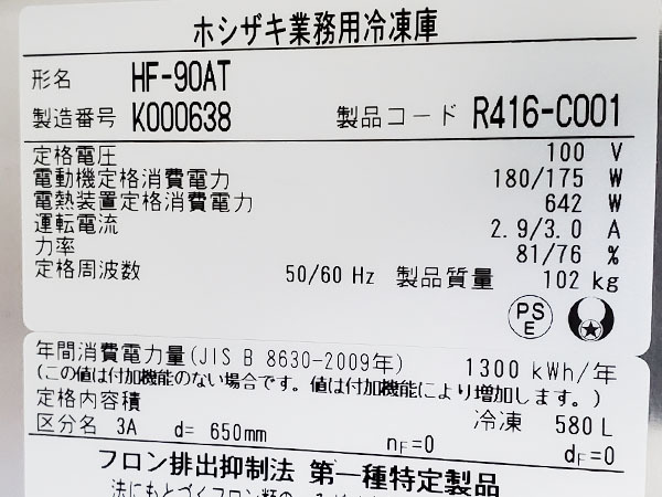 Z568/タテ型4面冷凍庫/ホシザキ/HF-90AT/冷凍580L/100V/W900xD650xH1910mm/2020年製/164万【23区内・横浜市内送料無料】