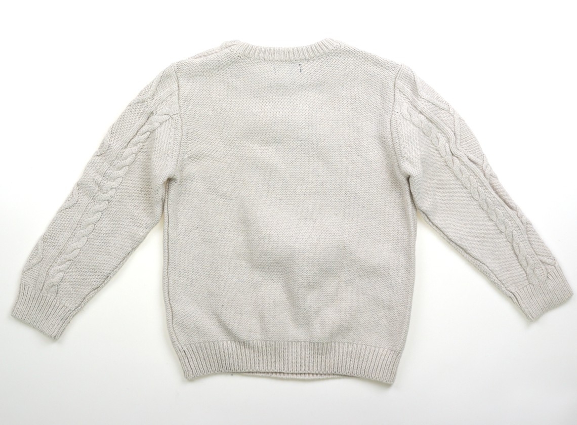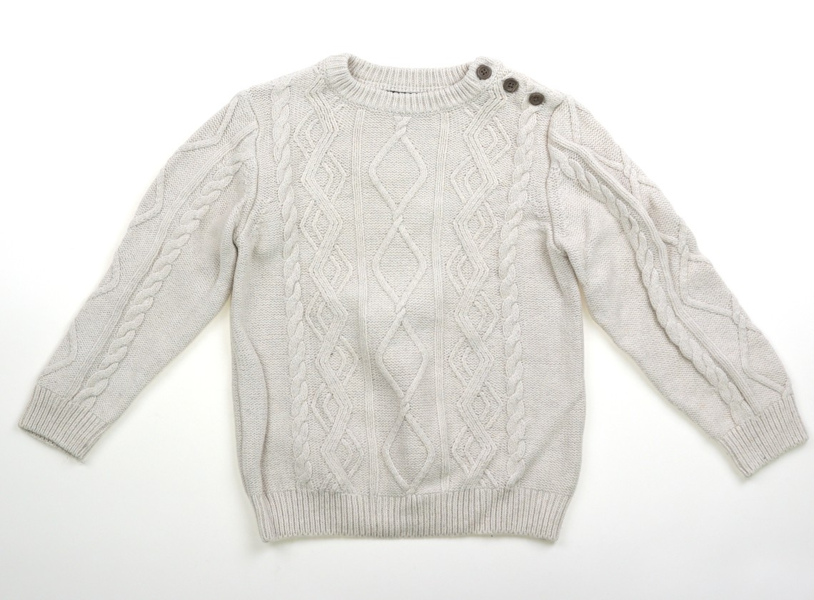 実際のサイズ表記は4-5y/110cmです。綿ナイロンのニットです。袖口に毛玉はありますがまだまだお使いいただけそうです。肩ボタンは開きます。