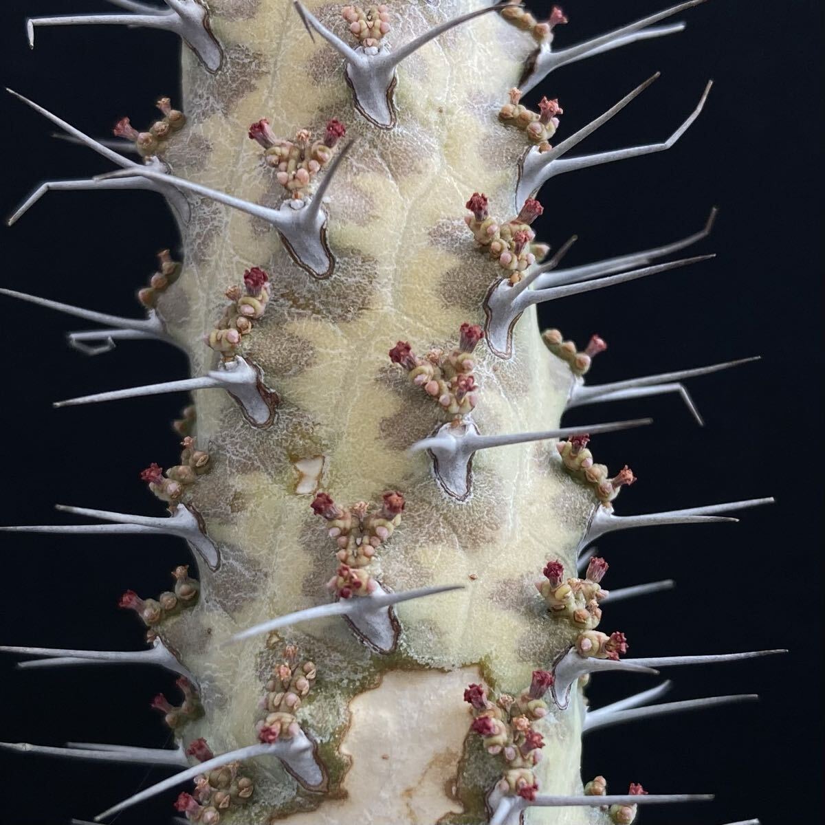 特に後半の画像はなかなか見られない開花時のものです。棘元に小さな臙脂の花を付けています。