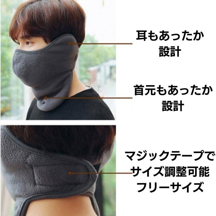 肌触りが良く暖かい素材を使用し、冷たい風から首元・耳・顔をカバー。