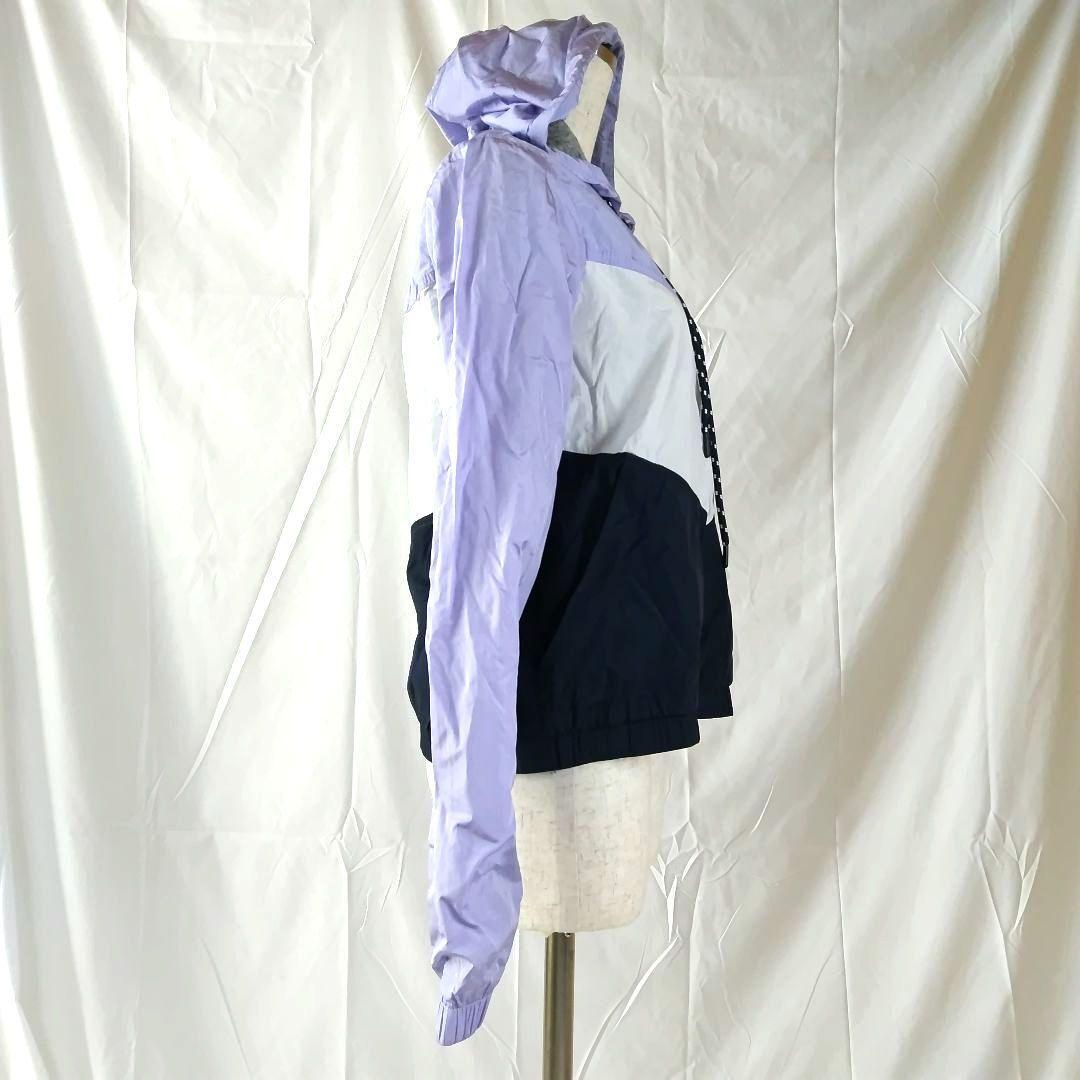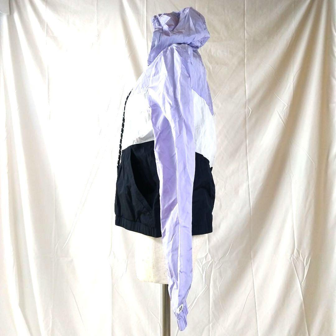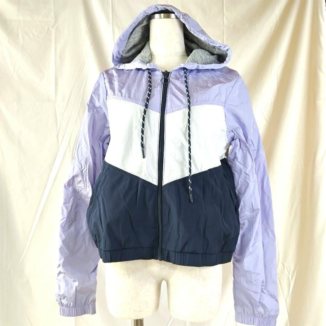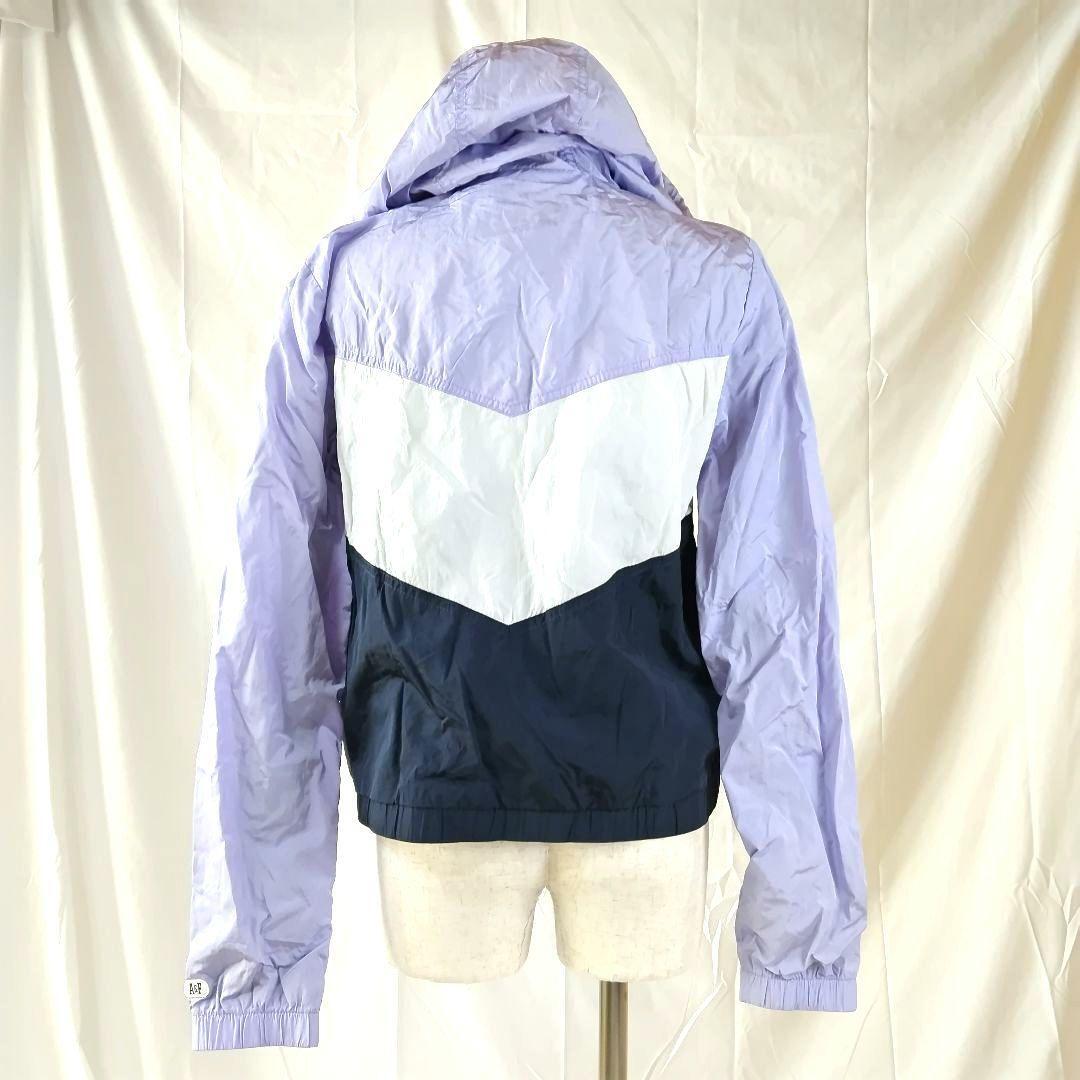 紫とネイビーのバイカラー、フード付きでV字型のデザインが特徴的なウィンドブレーカー。