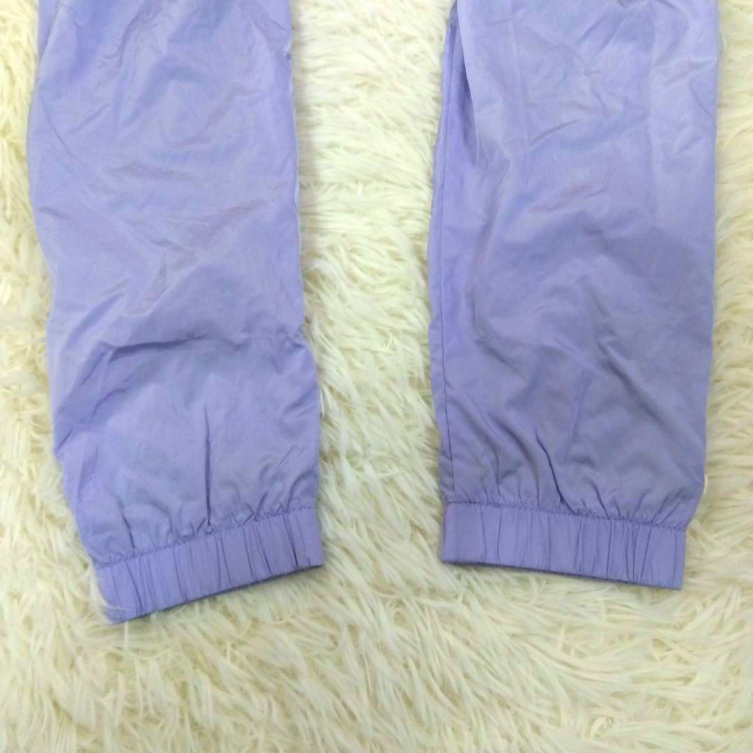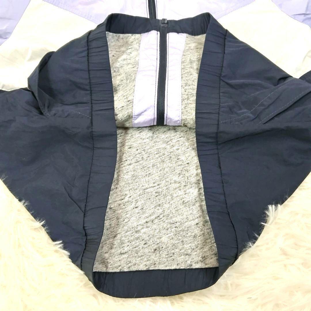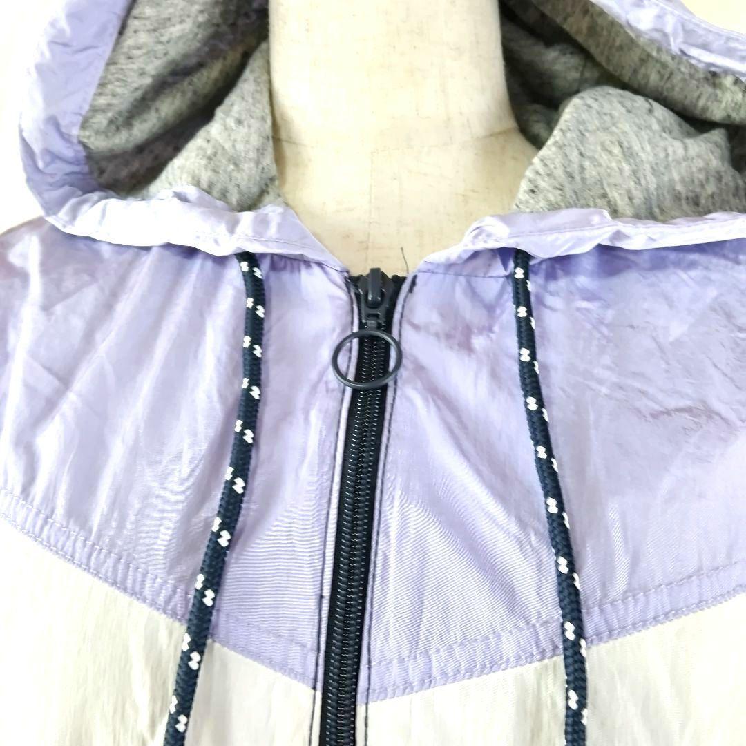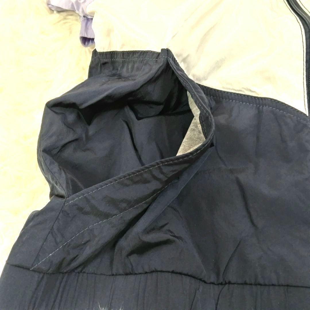 紫とネイビーのバイカラー、フード付きでV字型のデザインが特徴的なウィンドブレーカー。