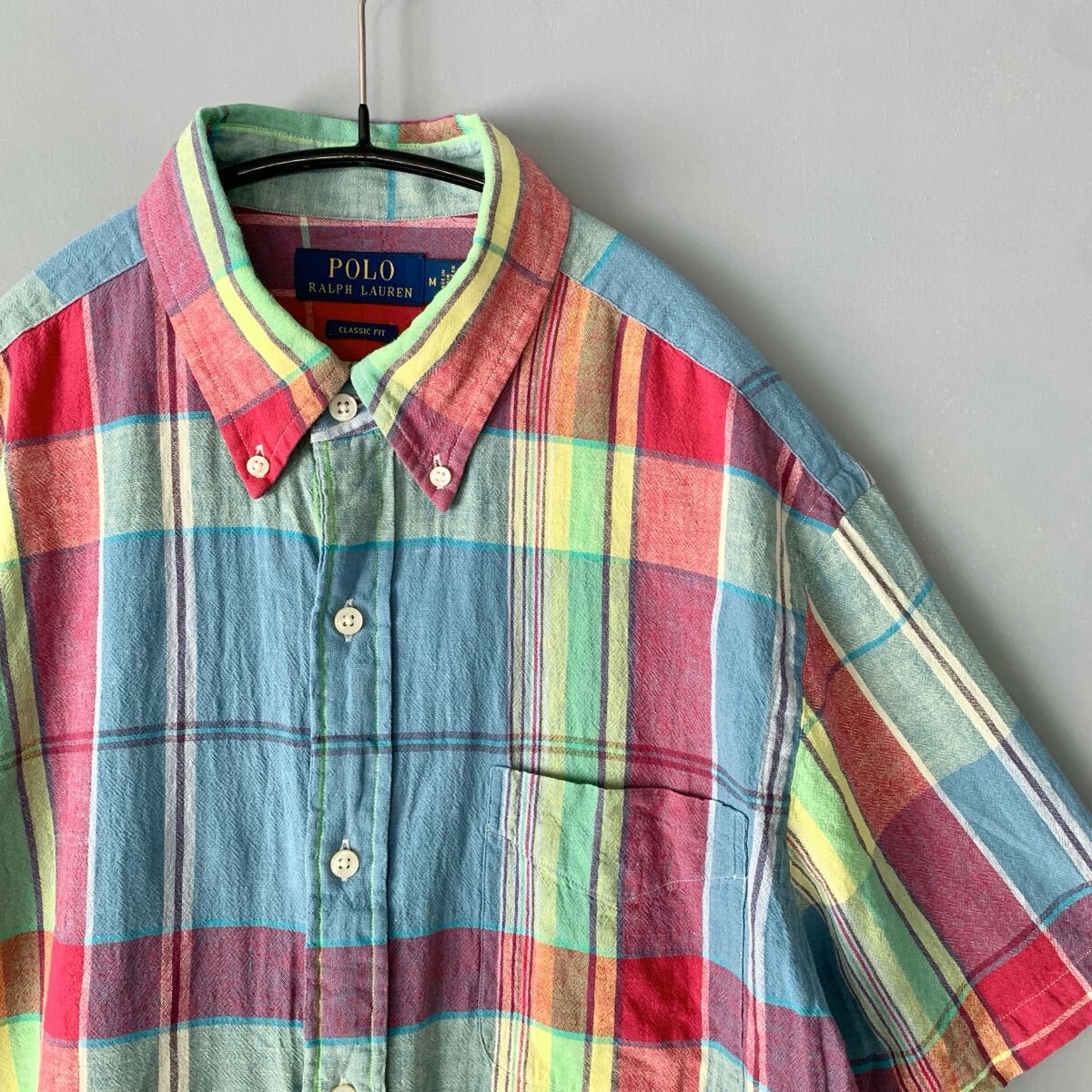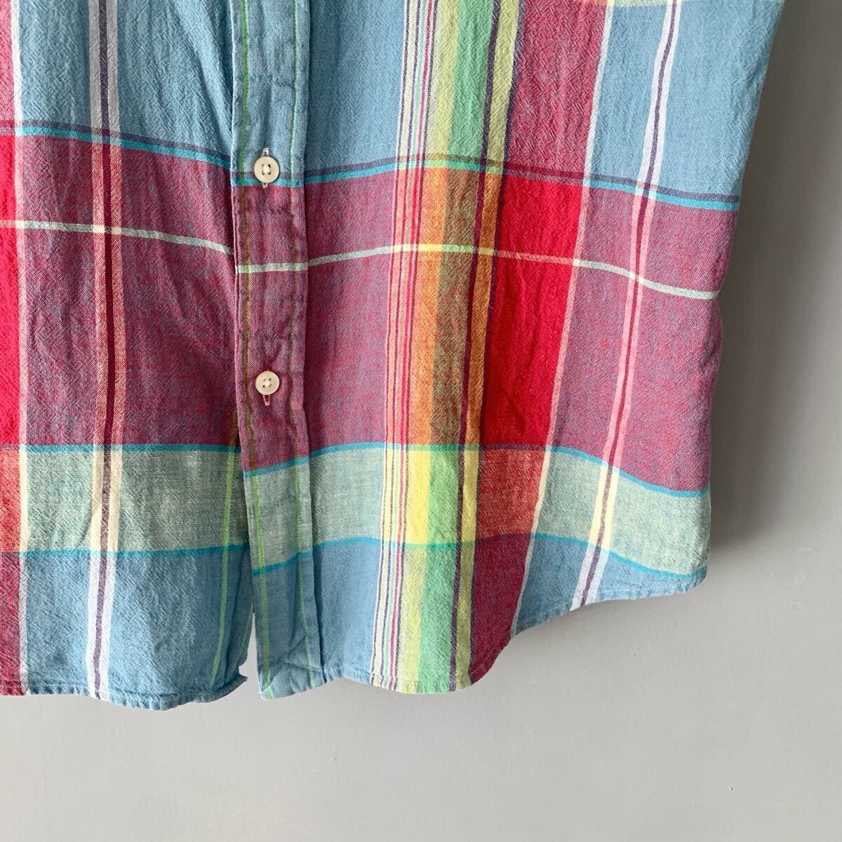 ポロラルフローレンのリネンコットン素材のボタンダウン半袖シャツです。ベースの色が白ではなく生成りっぽい色なのでなんとなく、くすんだ感じというかヴィンテージっぽい雰囲気を感じるマドラスチェックです。