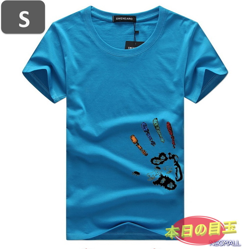 本日のお買得 ☆ 丸首 半袖 Tシャツ【457】 ブルー Sサイズ トップス シャツ シンプル イラスト デザイン 春夏
