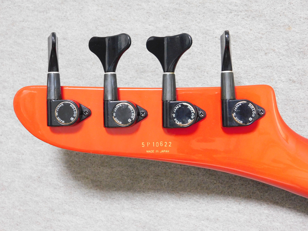 弦のテンションに影響するスケール(有効な弦長)は838mmで、一般的なロングスケールの約860mmよりは短いですが、ヤマハの820mm、フェルナンデスの812mmのミディアムスケールよりは長いです。また、ブリッジは一般的な後方から弦を通す方法と、ボディ裏側から通す方法を選択出来ますが、裏通しにした方が、僅かながら良いテンションを得られる様ですので、現在はこの方法で弦を張ってあります。