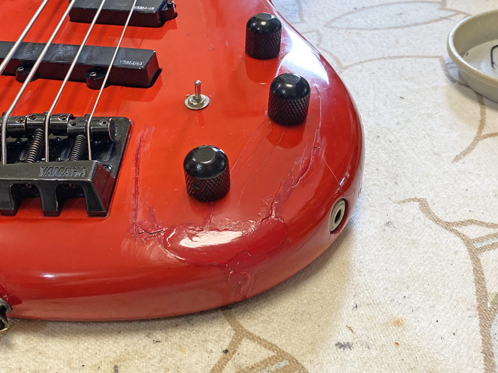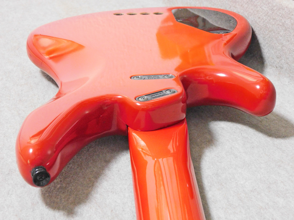 商品はアウトプットジャック付近にクラックが有った為、クラックが広がらない様に補修して、表面は出来るだけ滑らかにしてます。ちょっと目立つと思いますが、機能的には何ら問題はありません。ボディはコンパウンドで磨いて出来るだけキレイにはしてますが、塗装には経年変化による劣化が有るので、近くで見れば小さな塗装クラックが多数見えます。リヤPUにはピックキズが多いです。