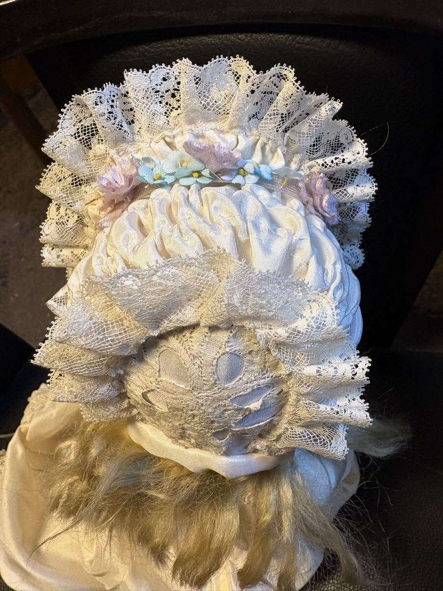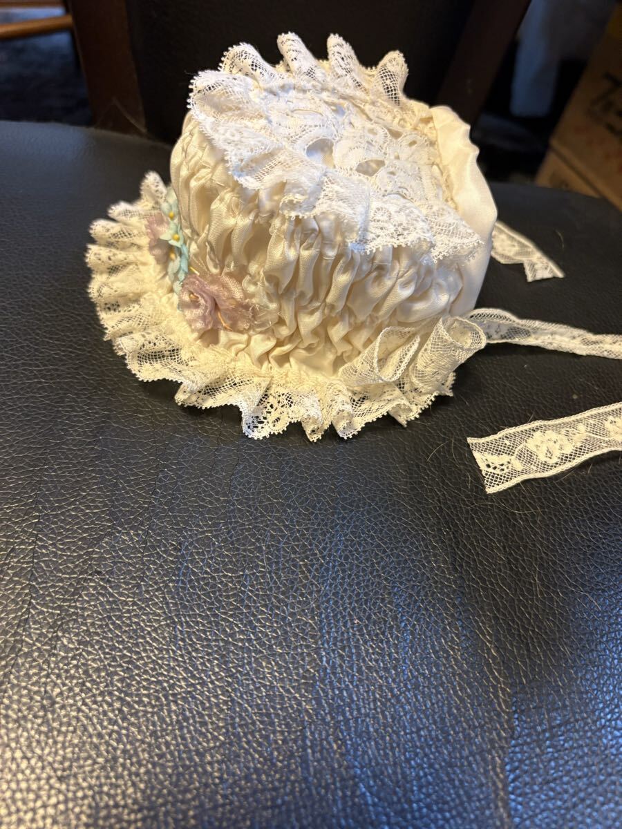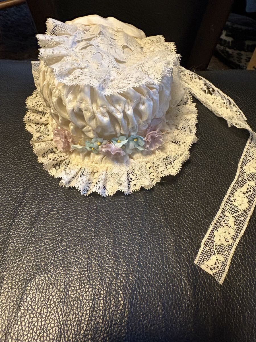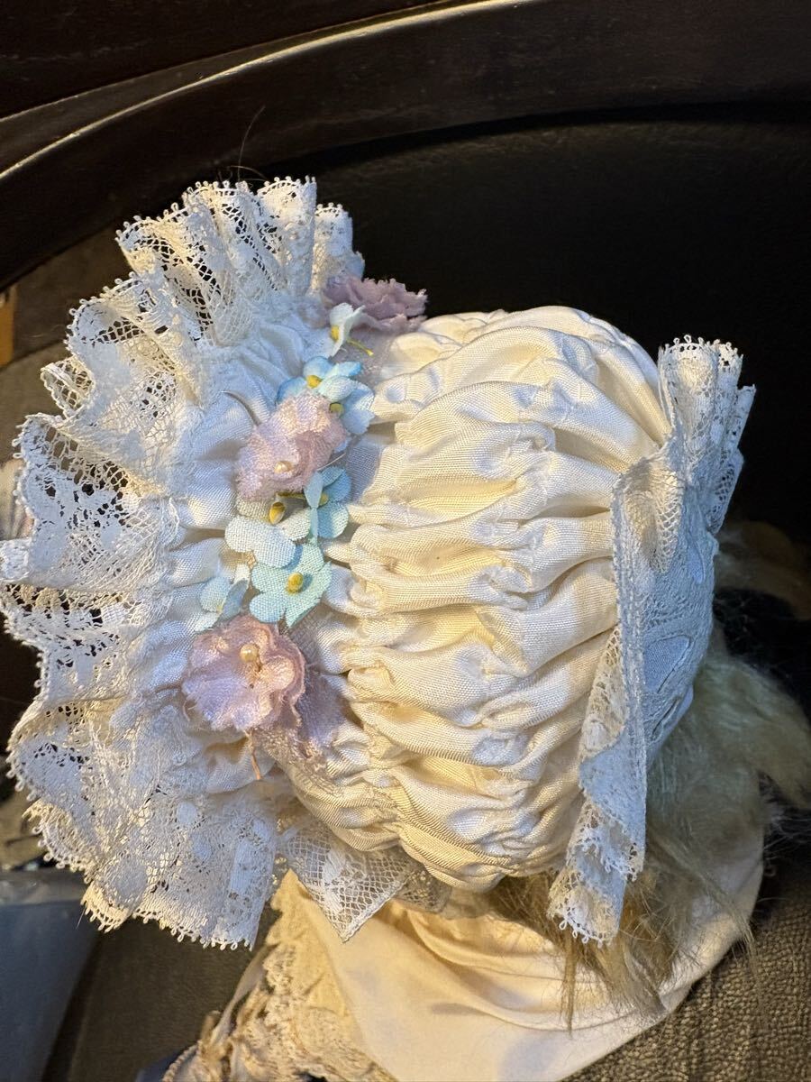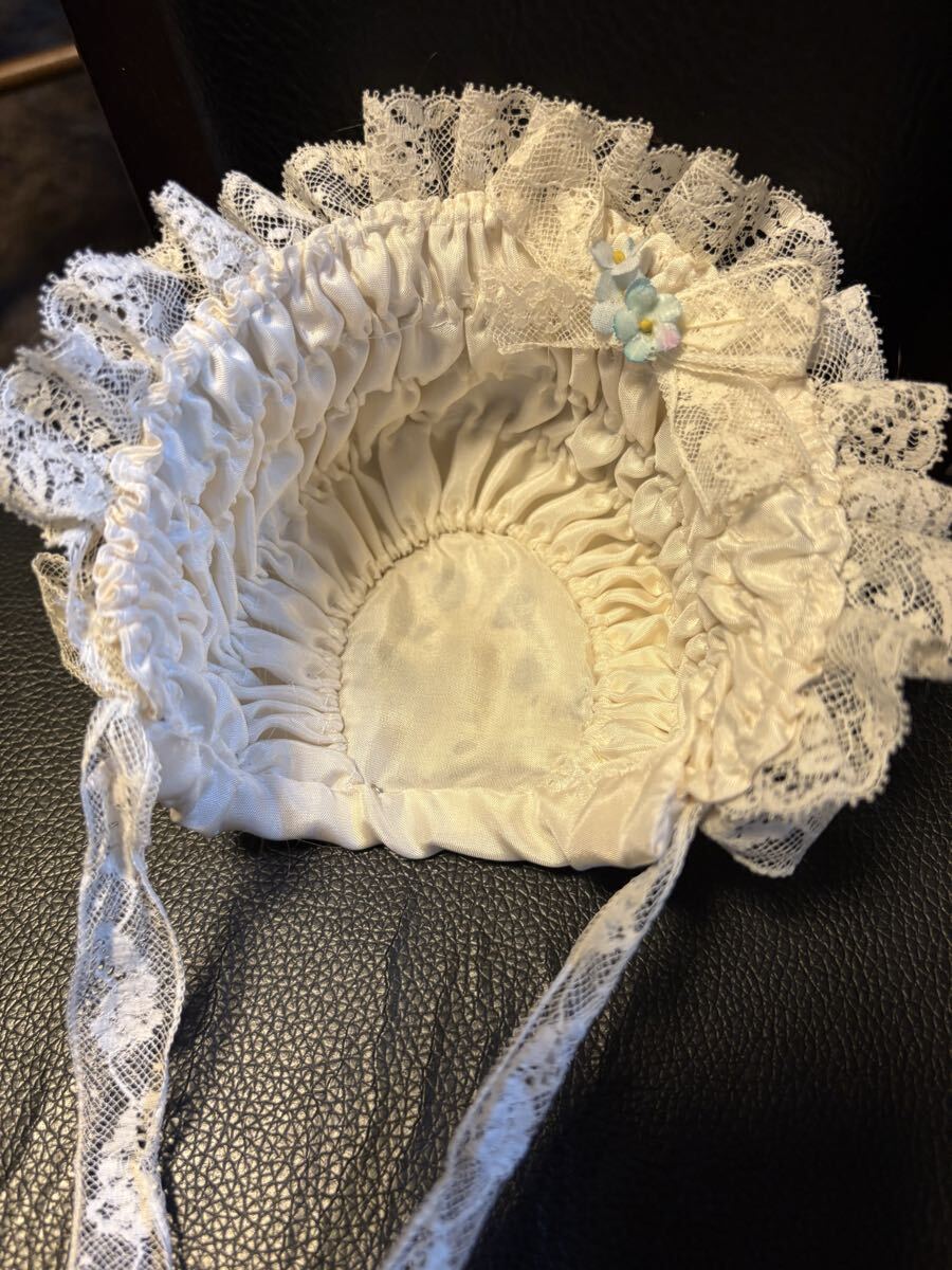 オフホワイトのシルクでワイヤーボネを作りました。フランスレースと沢山の小さな布花で飾りました。