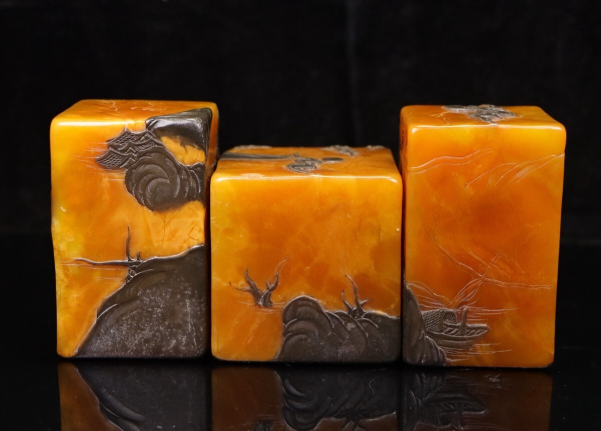 「清 蒋仁製印 老寿山石 烏鴉皮田黄石彫り 山水人物 閑章 印章」極細工 擺件 古賞物 中国古美術 旧蔵出