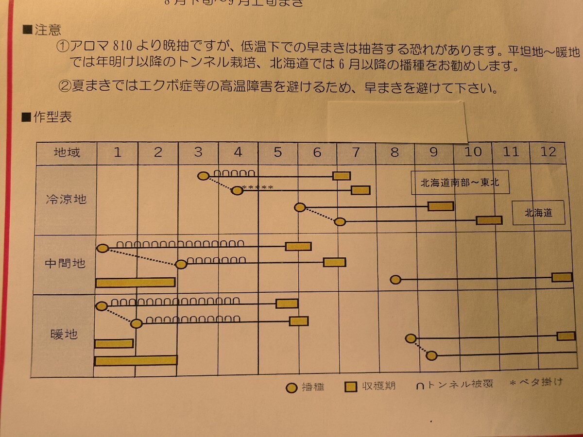アロマ810より晩抽ですが、低温下での早まきは抽苔する恐れがあります。