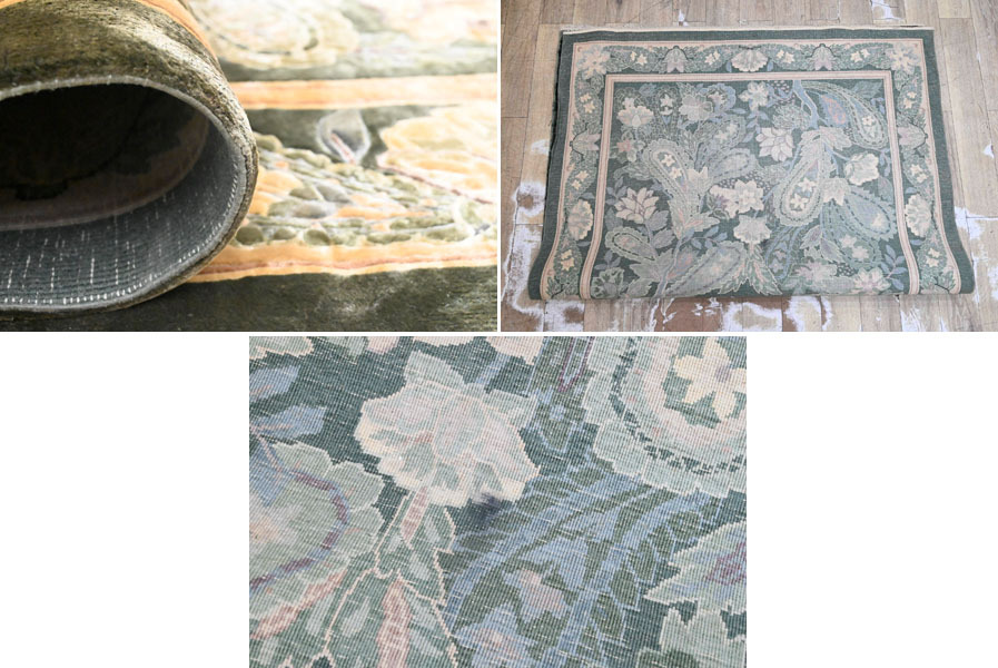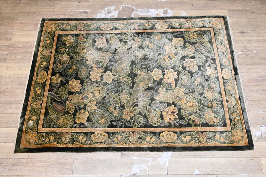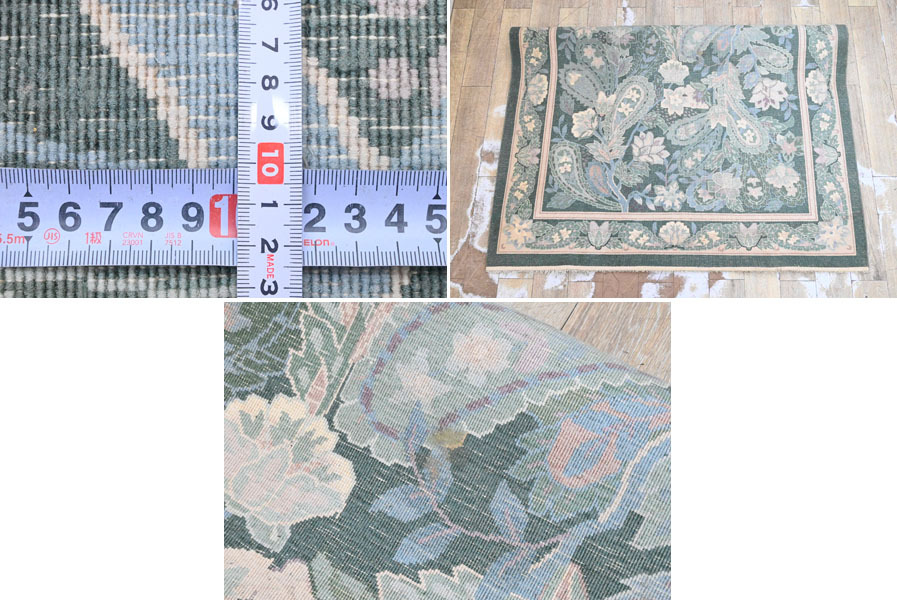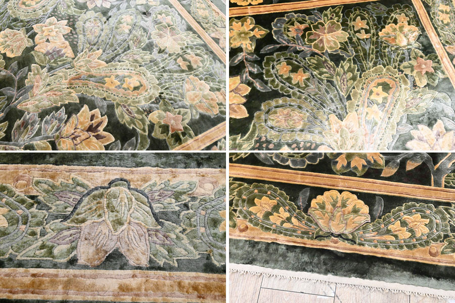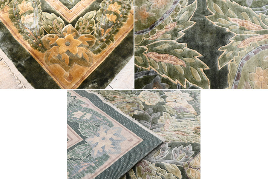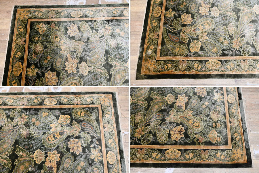----------------------------------------------------------------------------------------- ●送料や注意事項は必ずご確認下さい。落札後にトラブルになるケースが増えております。● ◆コンディションは写真・文章にて記載して有りますが、全てのキズの写真は掲載致しておりません。大きなダメージを除き見落とし、記載漏れが有る事はご了承下さい。 ◆当サイトにて出品する商品は多種多彩で、当方商品知識の無い物も多数ありますので落札後の質問やメンテナンス等にはお答えできません。 ◆入札された時点で、画像、文章をご理解していただいたものと判断させていただきます。不明な点は前もってQ&Aからお願い致します。入札後の質問やお電話等でのキャンセルは一切受け付け致しません。 ◆商品説明に「ノークレーム」と記載しているものに関しては、如何なる状況で届いても保証致しません。詳しくは注意事項の「商品到着後について」の最後に記載しておりますのでご確認下さい。 ---------------------------------------------------------------------------------------- 見る物を魅了する高級段通、中古品の出品です。 シルクを100%に使用しているため、見る角度や毛並みにより、表情を変える最高級のお品です。 圧倒的な重厚感と、見る者を魅了するデザインは、お部屋の雰囲気を更にアップさせるでしょう。 幅241x166cm(房含む) 厚10mm 【コンディション】 房切れ、薄汚れ、薄シミ、置き跡、チリ残り等有ります。 当方でクリーニング等はしておりません。 | ||