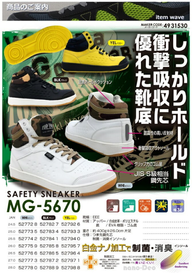 MG5670 BLK カラー ブラックしっかりホールド衝撃吸収に優れた靴底■足首ホールドクッション■認識性の高い反射材■衝撃吸収アウトソール■グリップ力のゴム底■JIS S級相当鋼先芯・靴幅:EEE・材質:アッパー/合成皮革・ポリエステル 底/EVA樹脂 ゴム底・重さ:約400g※26.0cm片足・仕様:つま先鋼先芯 制菌・消臭インソール