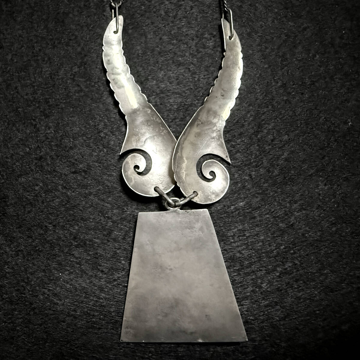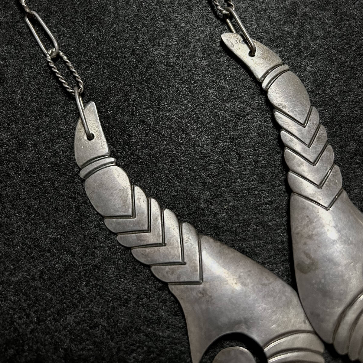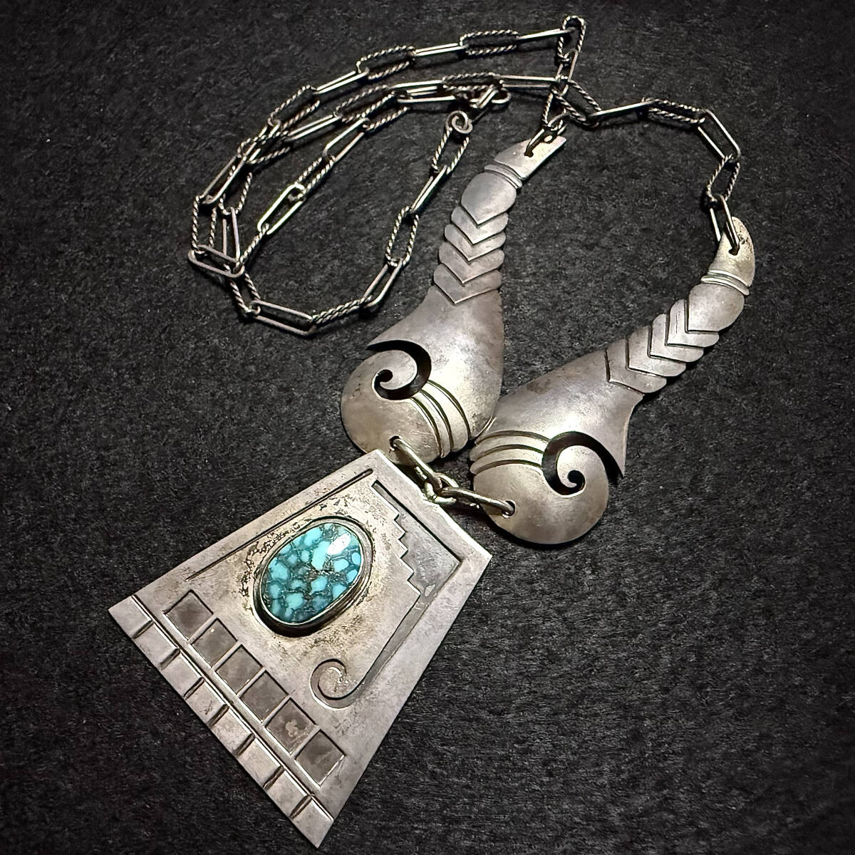 【HOPI】ホピの偉大な作家【Morris Robinson】モリス・ロビンソン(1901-1984)によって制作された作品で、オーバーレイで造られた台形のトップとファイルワークで造られた立体的なパーツがハンドメイドチェーンで繋がれたボリューム感のある超貴重なビンテージネックレスです。