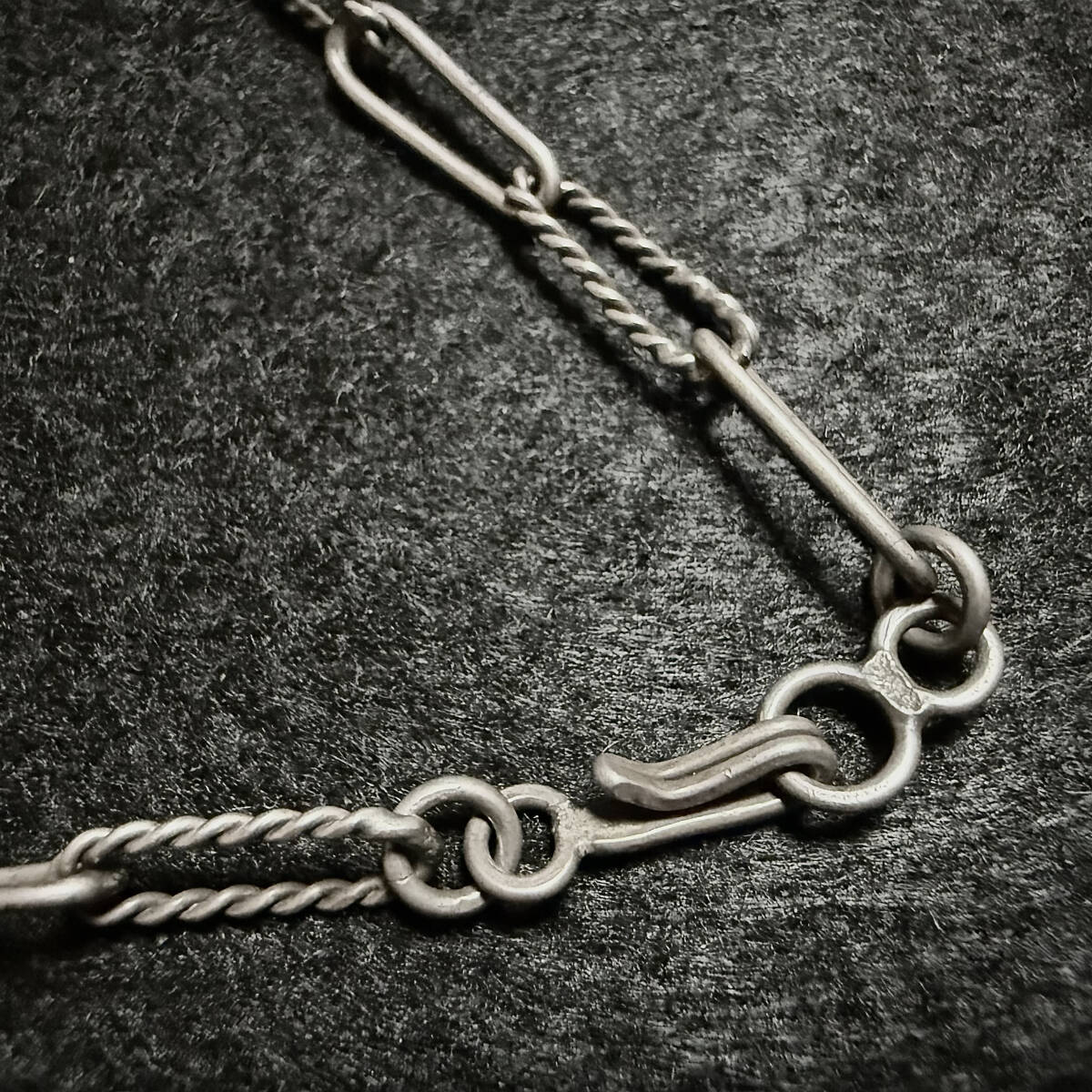 1950年代~1960年代頃に作られた作品と思われ、シルバーチェーンもすべてハンドメイドによって製作されています。特にこちらのチェーンはコマ自体にツイステッドワイヤーが使用されており、非常に手間のかかる工程で作者の拘りを感じるチェーンとなっています。