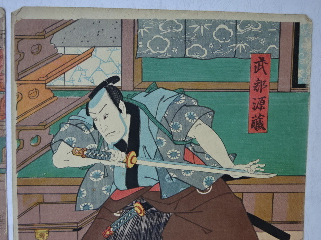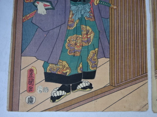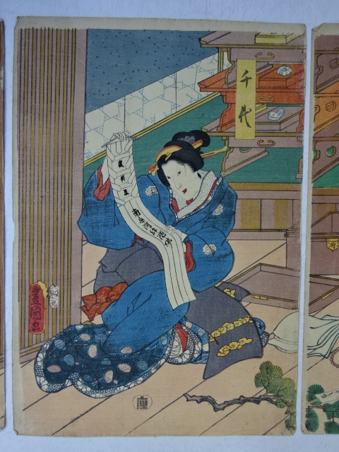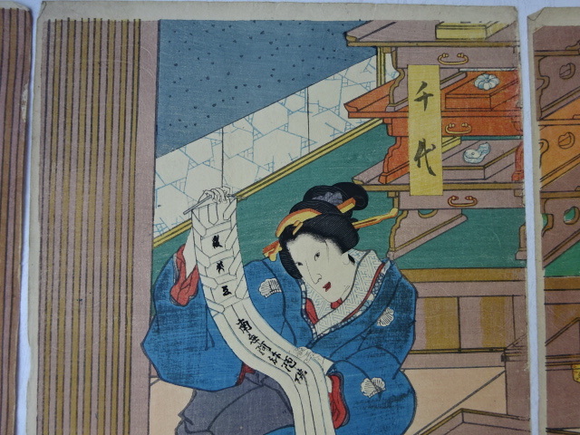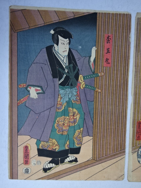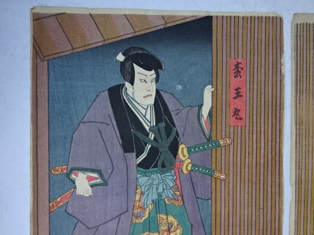浮世絵 歌川豊国 真作 江戸期 木版画 役者絵 3枚SET『 李玉丸 千代 武郭源蔵 』版画 本物保証