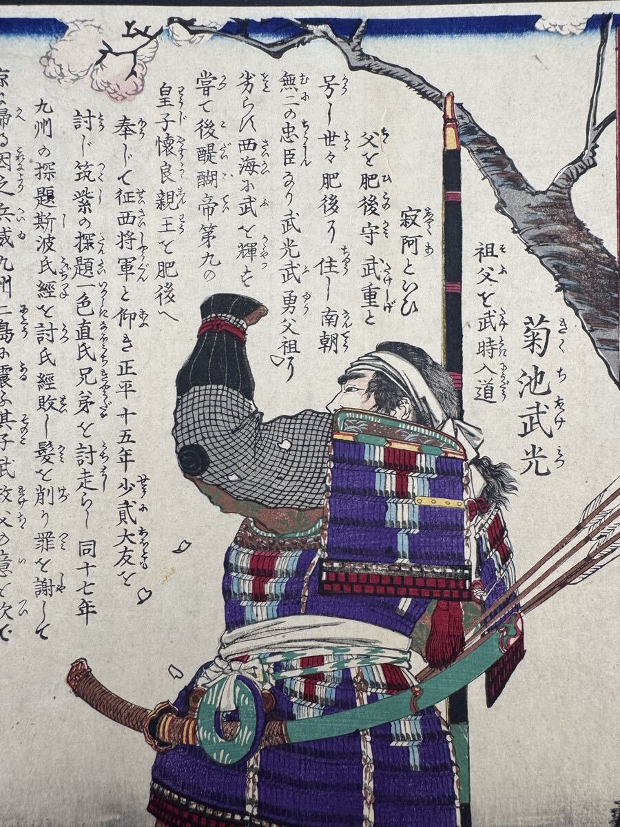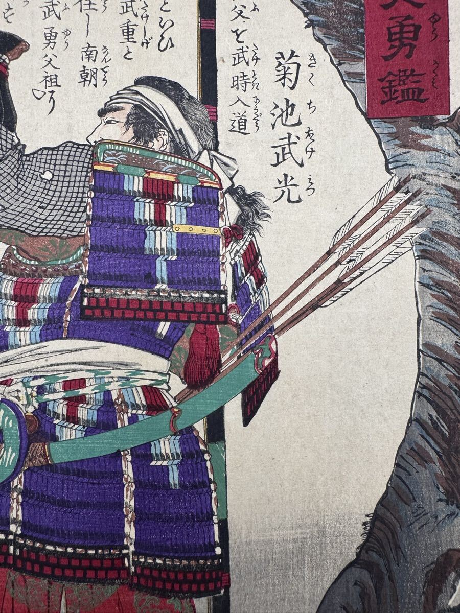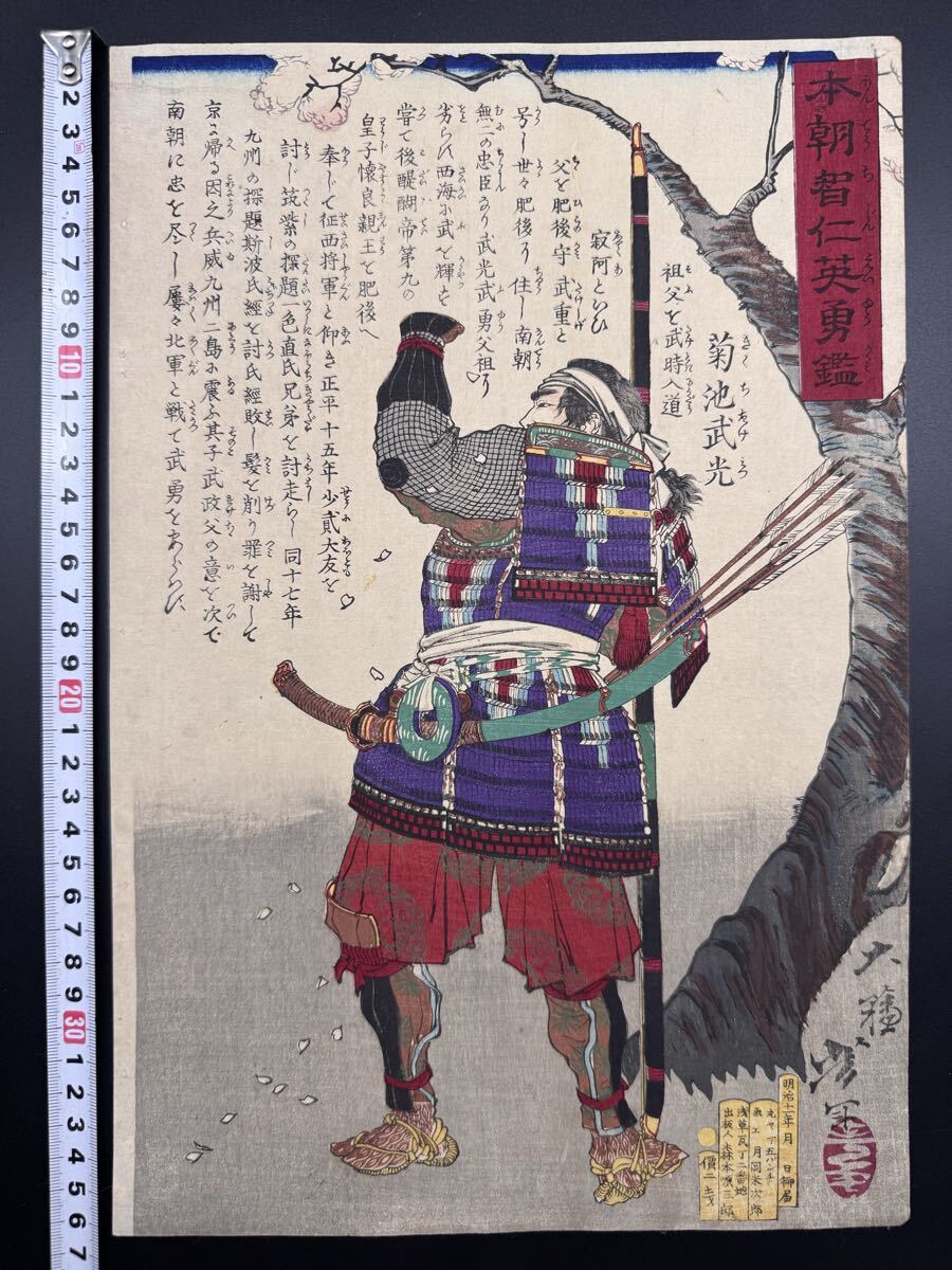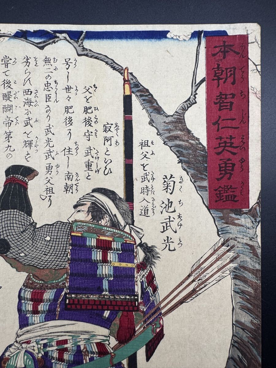 【真作】名作!本物浮世絵木版画 月岡芳年【本朝智仁英勇鑑 菊池武光】明治期 武者絵 大判 錦絵 保存良い