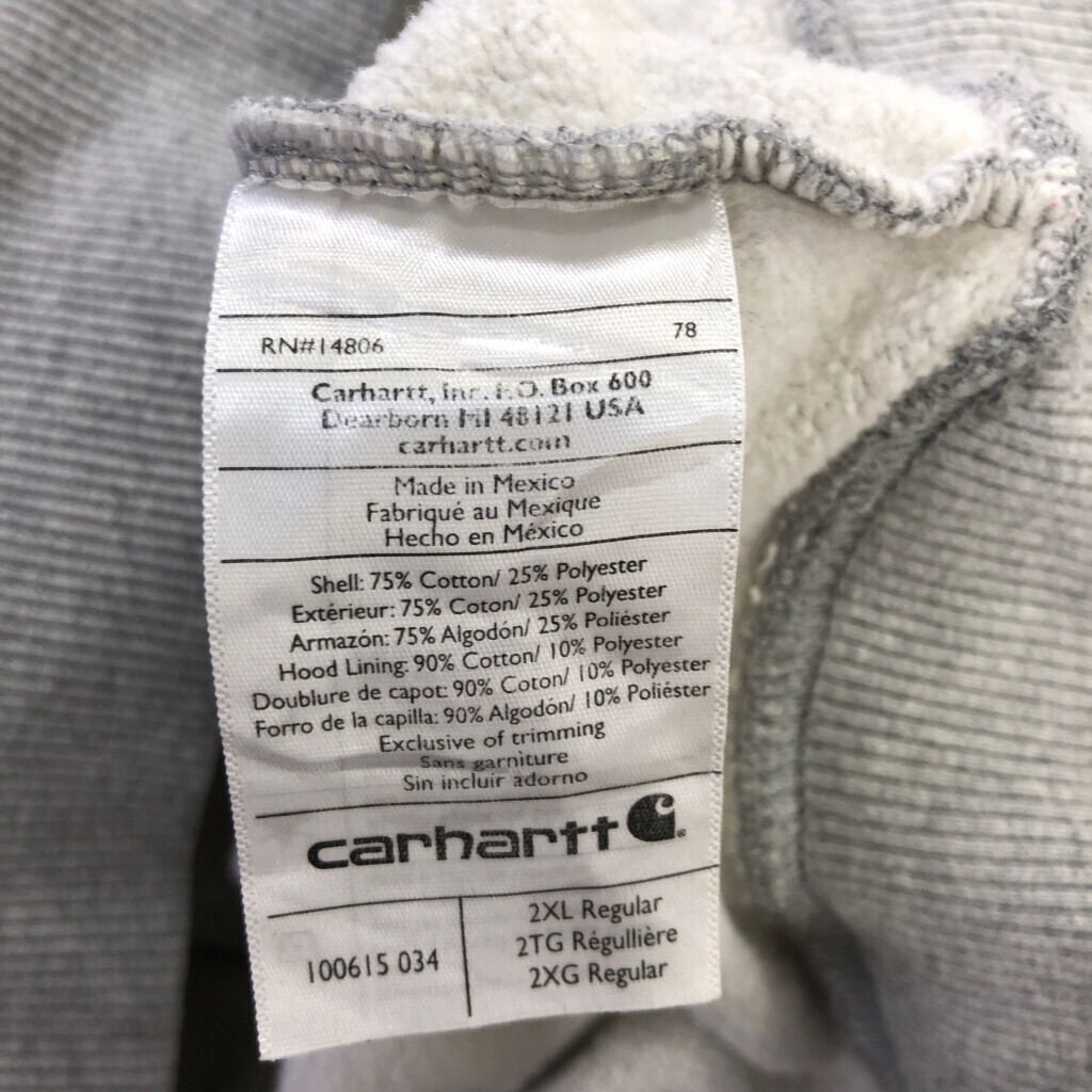 【商品管理番号】 P8653 【ブランド】 Carhartt/カーハート 【サイズ】 2XL 【実寸サイズ】 肩幅:約57cm 着丈:約72cm 身幅:約74cm 袖丈:約65cm 【主な素材】 表地 : コットン 【色】 グレー 【仕様】 トップス、大きいサイズ、刺繍、ワーク 企業ロゴ 【状態】 汚れ:フード、首元、袖、袖先、胸、腹部、裾 特記事項: 全体的に使用感有り |
