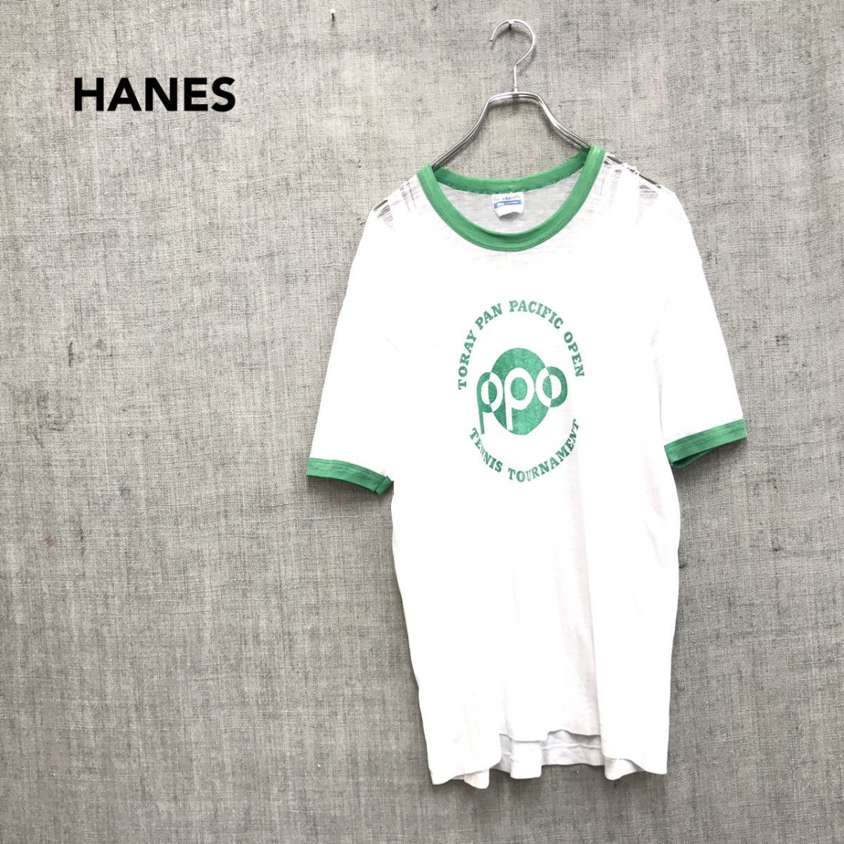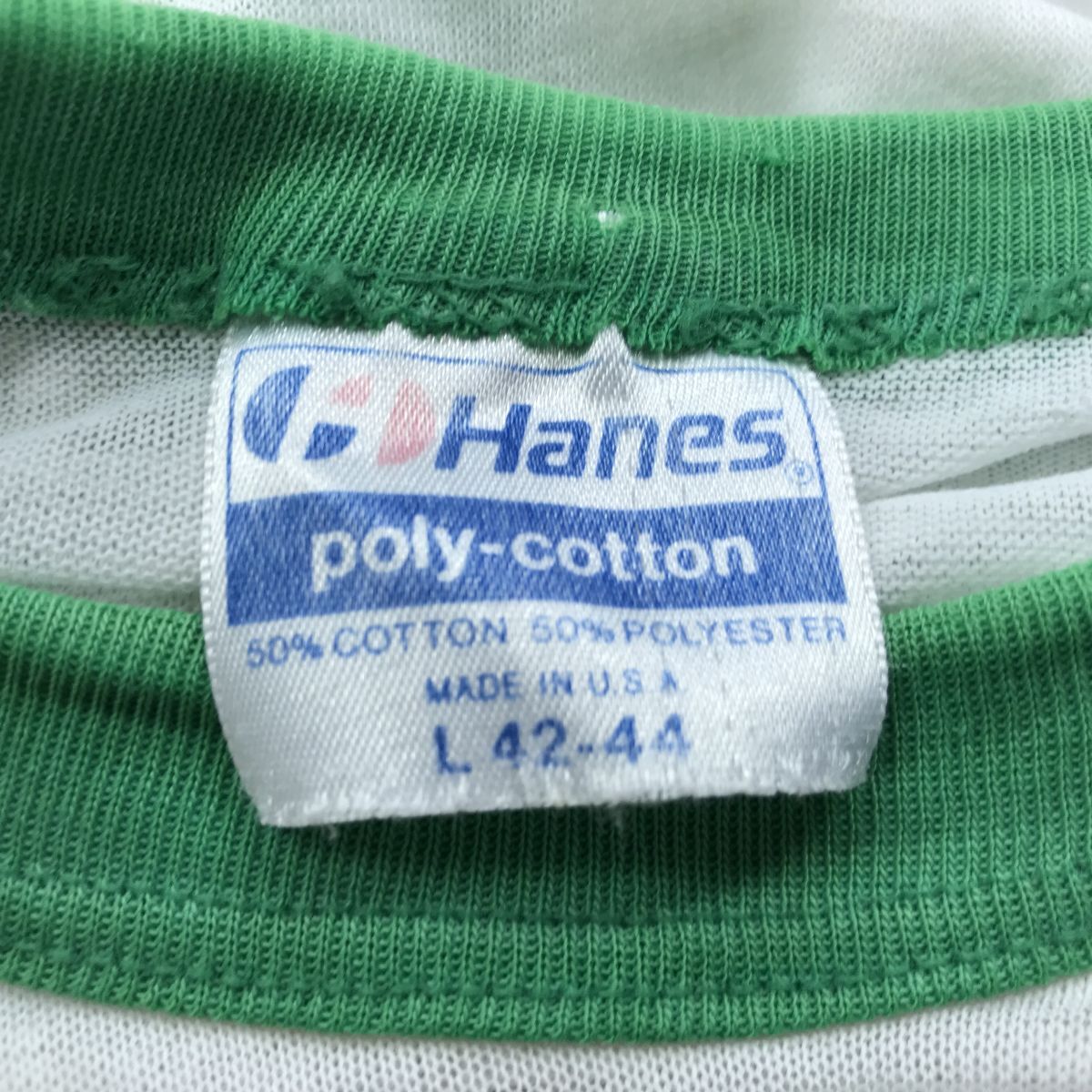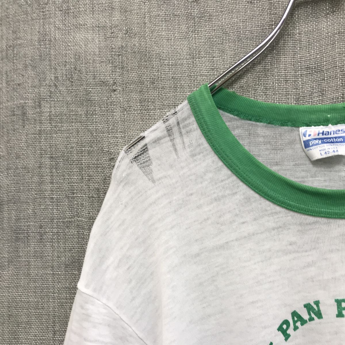 2K1301-N◆80s◆USA製 HANES ヘインズ 半袖Tシャツ カットソー リンガーTシャツ ◆sizeL ホワイト グリーン コットン ポリ
