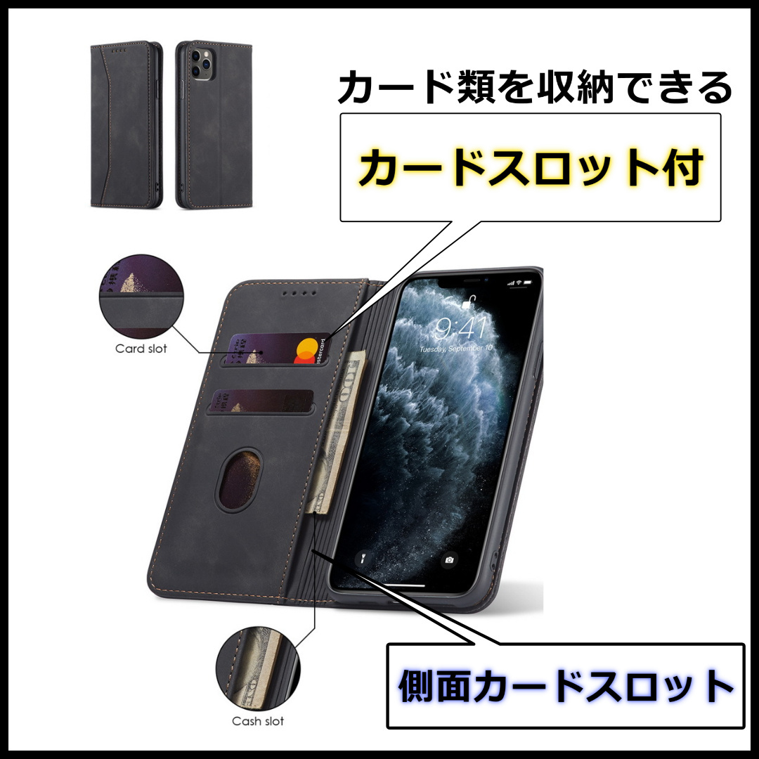 シンプルなデザインの多機能手帳型のiPhoneケースです。