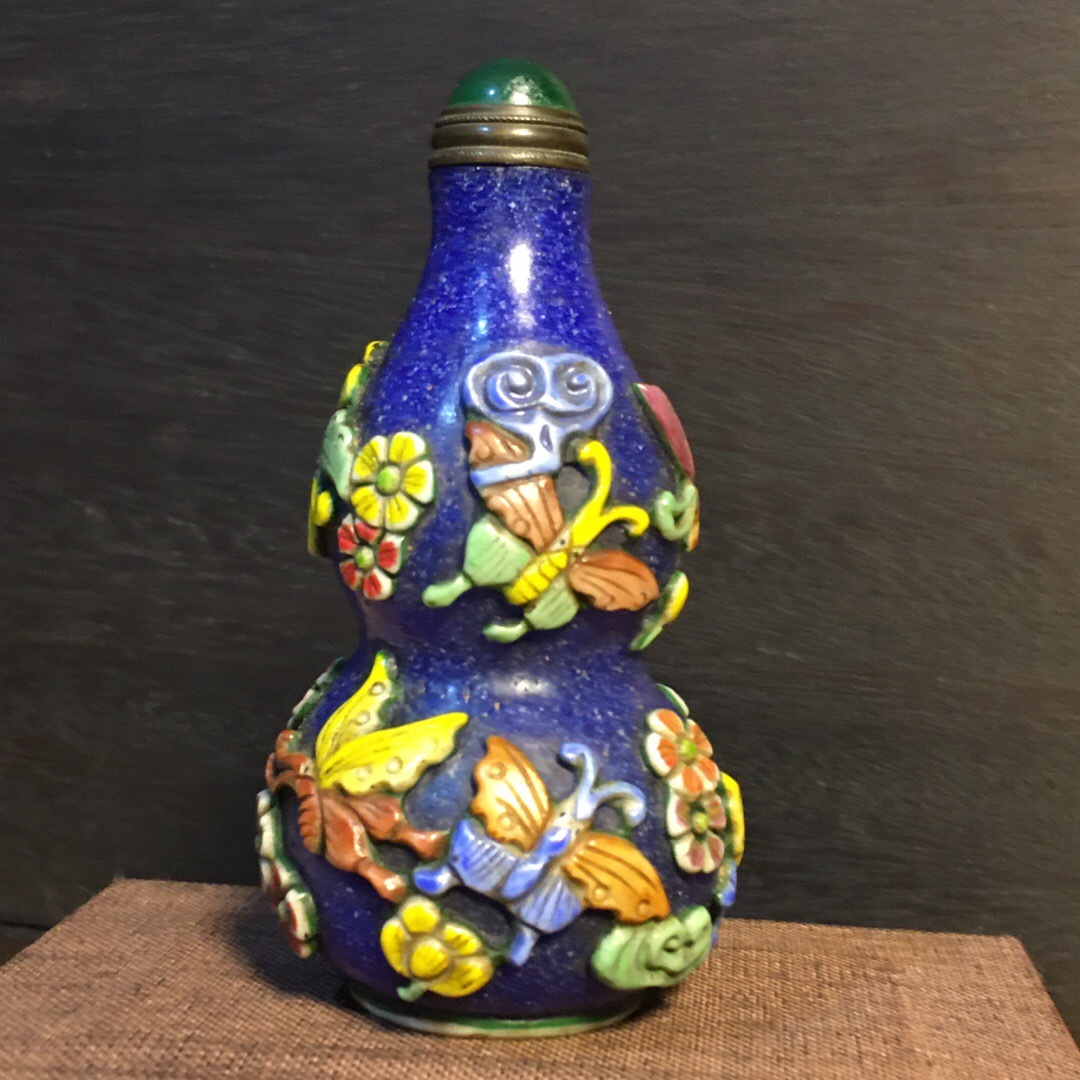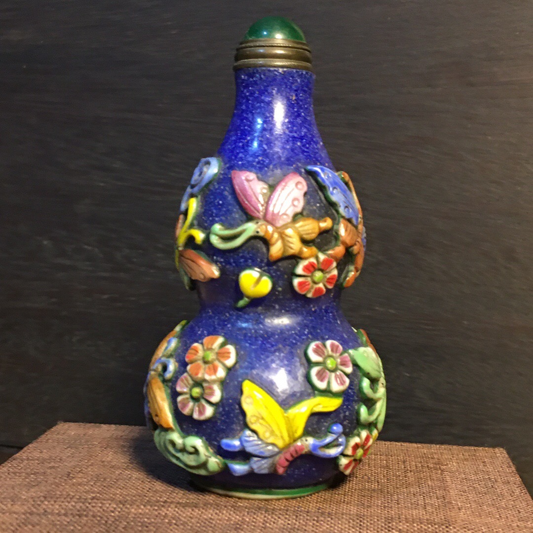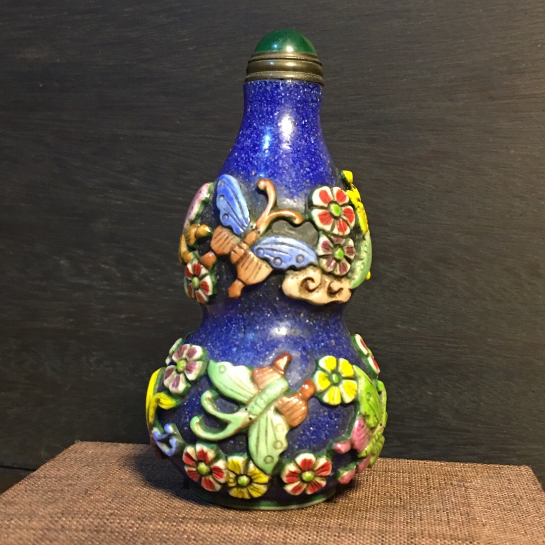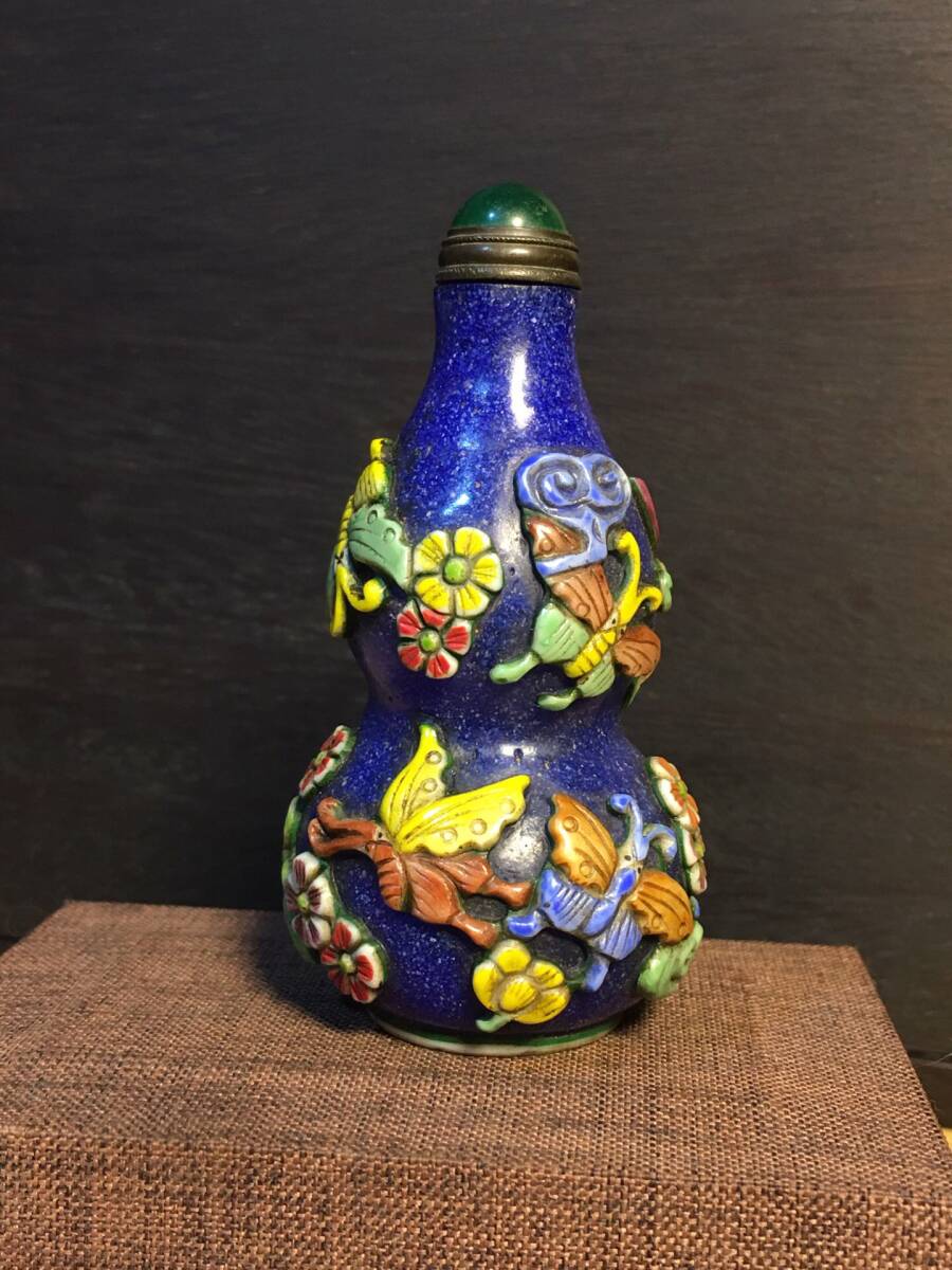 【蔵友館蔵品・琉璃製・細密彫・彩繪・蝶來花開紋・鼻煙壺・根付・裝身具】・古董品・中国古玩・時代物・希少珍品・中国時代美術 |