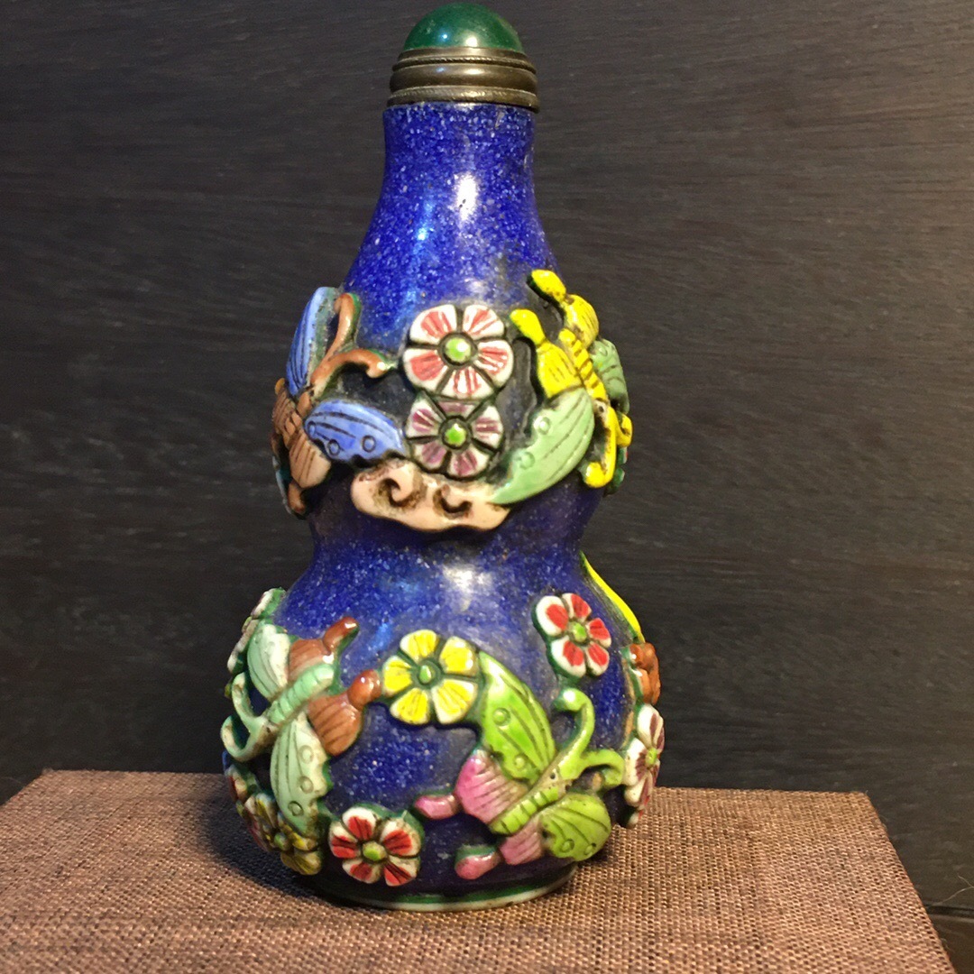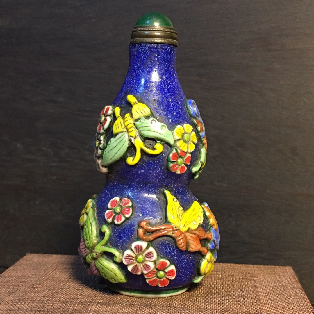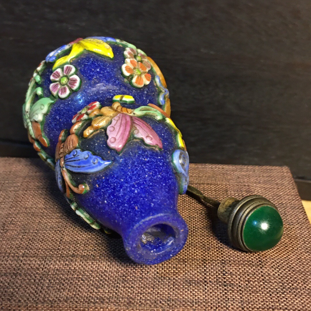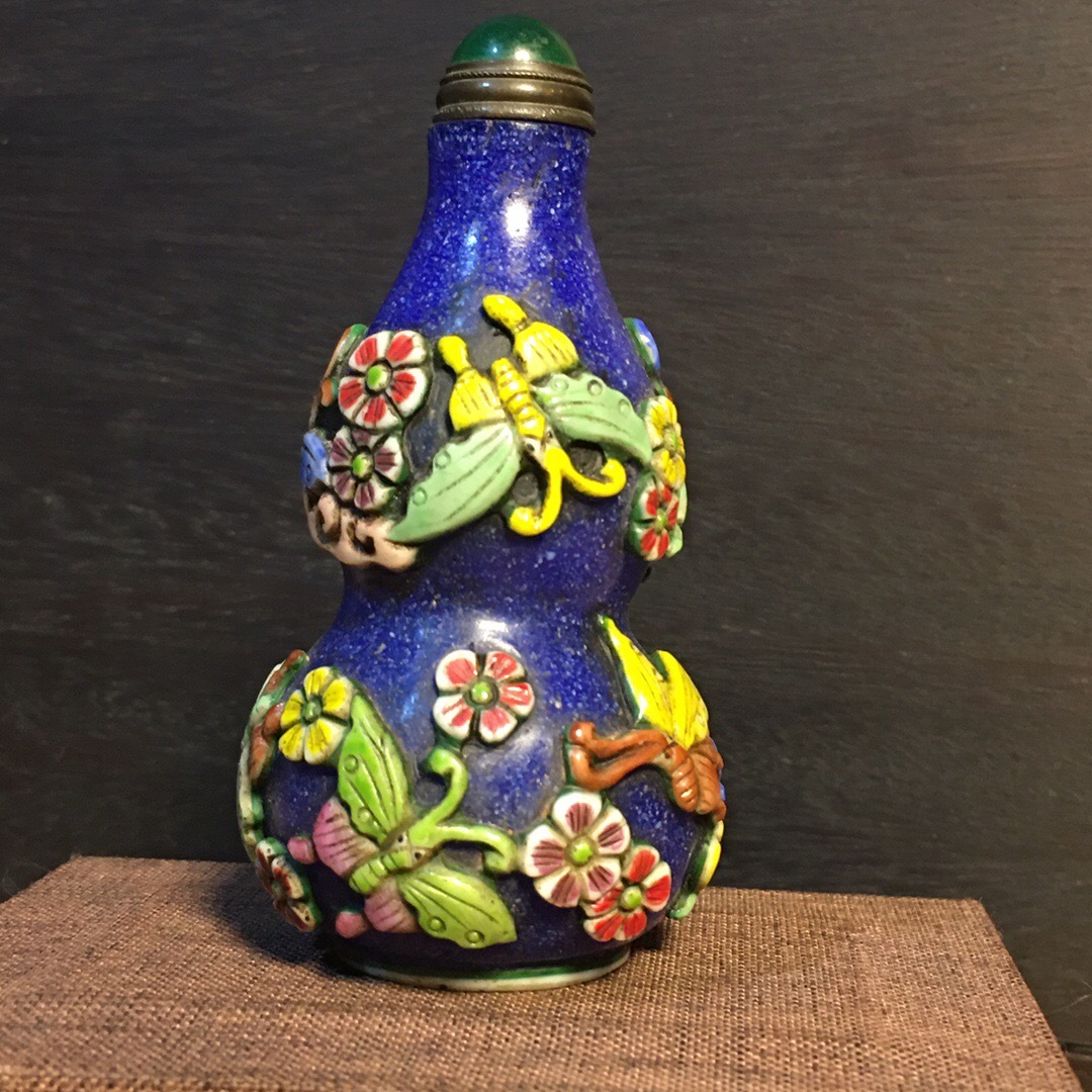 【蔵友館蔵品・琉璃製・細密彫・彩繪・蝶來花開紋・鼻煙壺・根付・裝身具】・古董品・中国古玩・時代物・希少珍品・中国時代美術 |