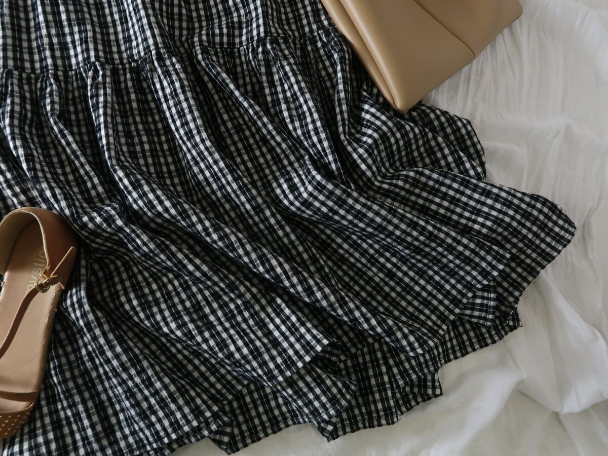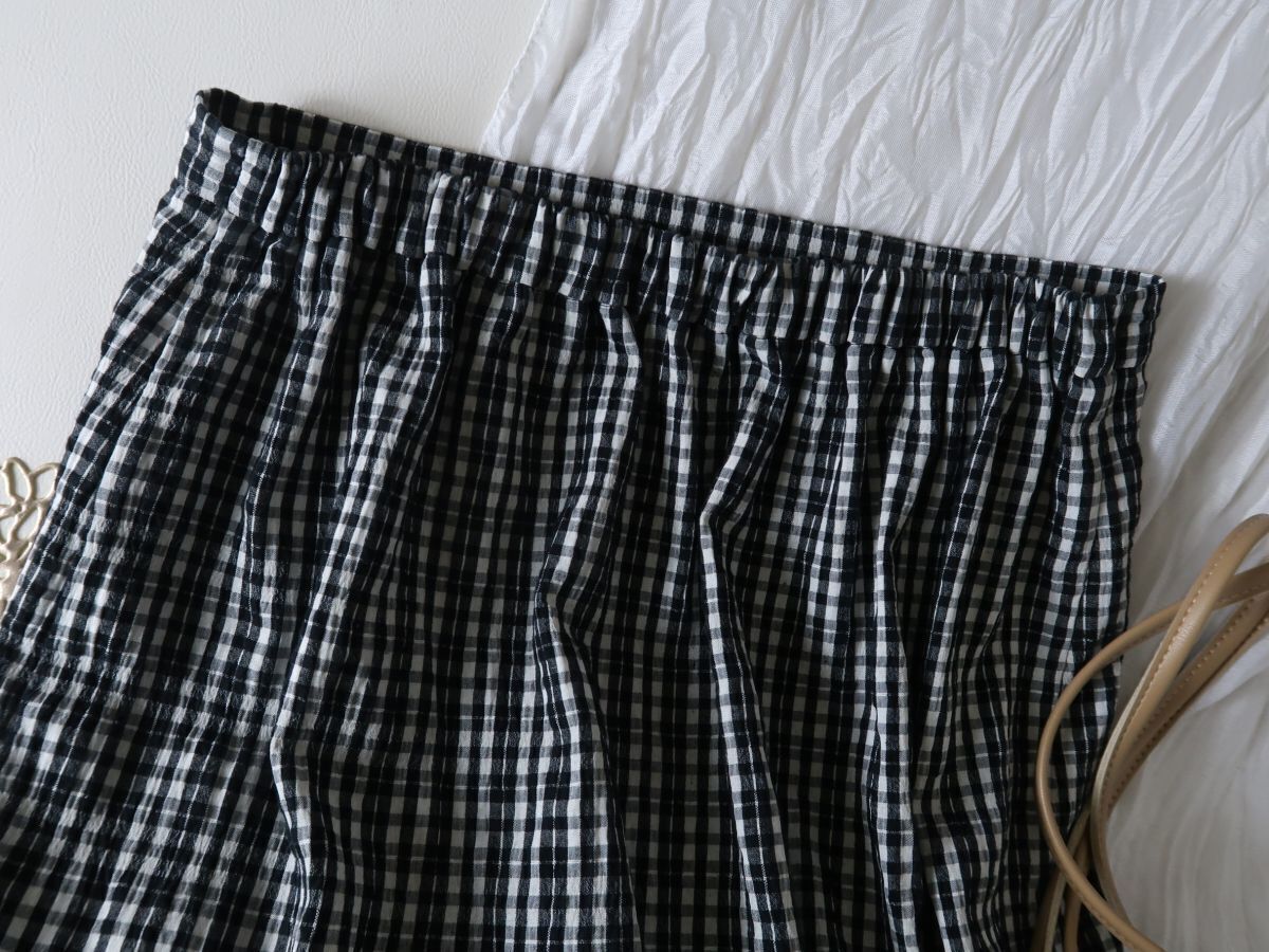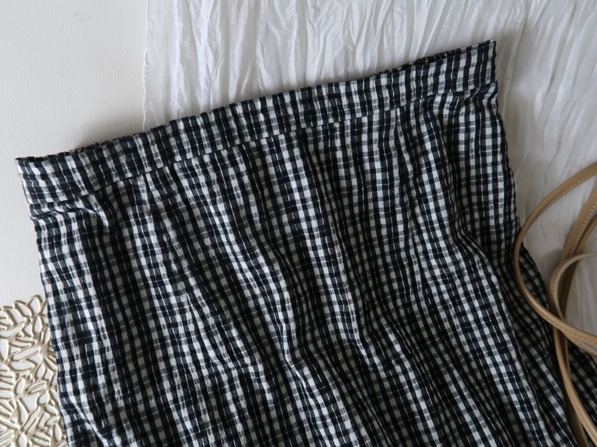 カジュアルな印象のギンガムチェックながら、裾の切り替え部分にギャザーを寄せ、女性らしいマーメイドシルエットに仕上げました。