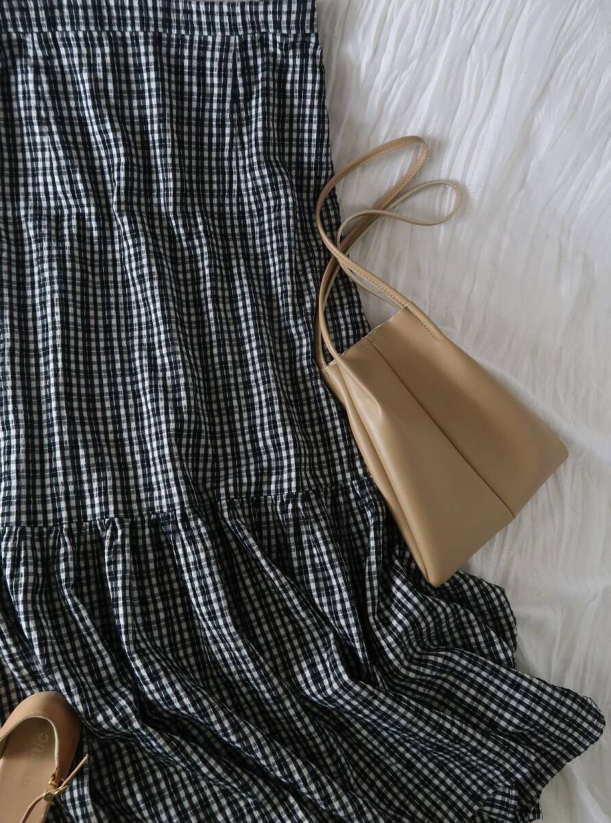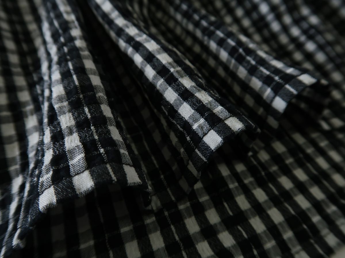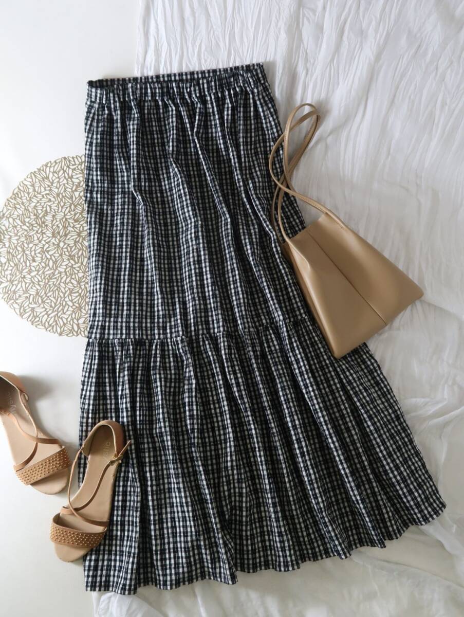 カジュアルな印象のギンガムチェックながら、裾の切り替え部分にギャザーを寄せ、女性らしいマーメイドシルエットに仕上げました。
