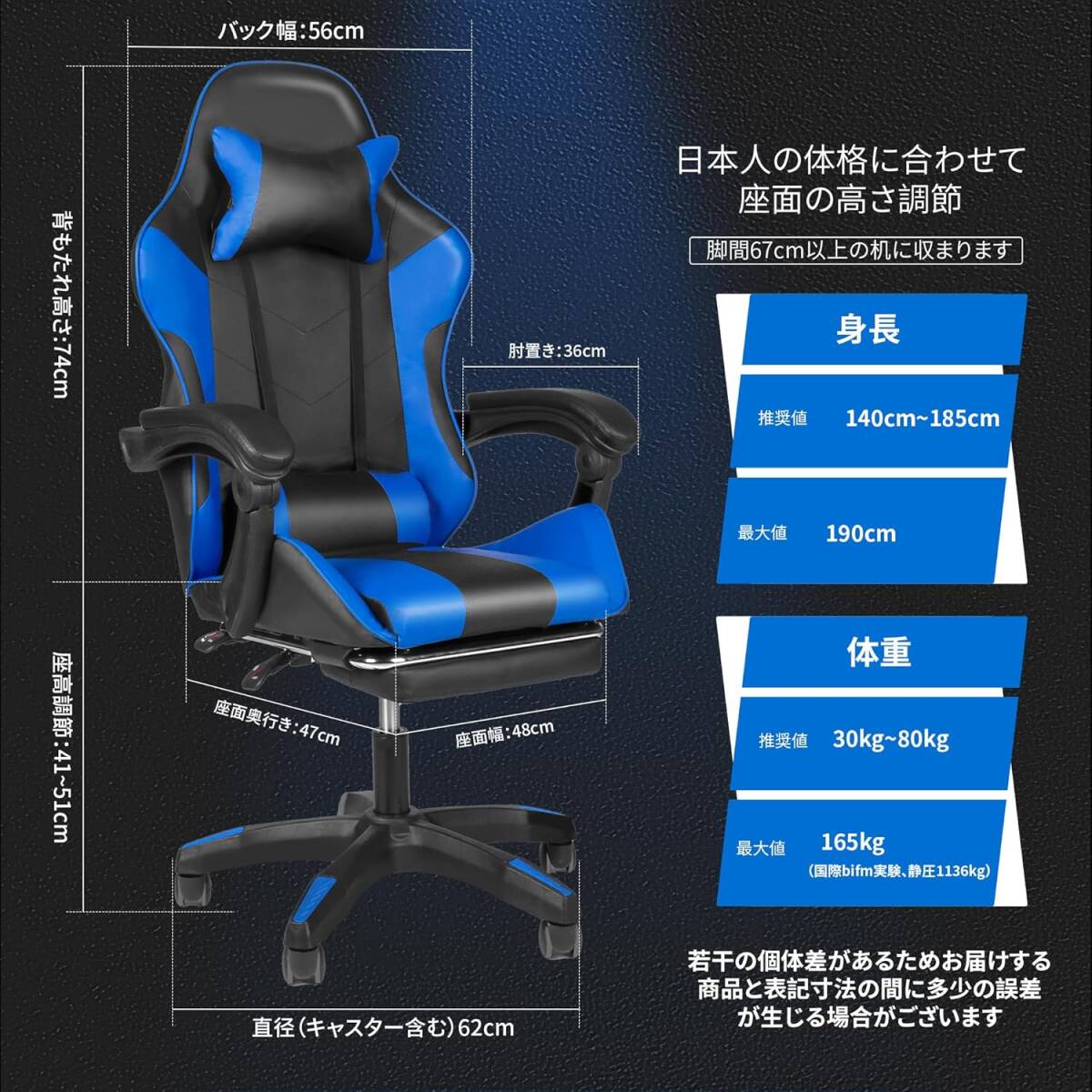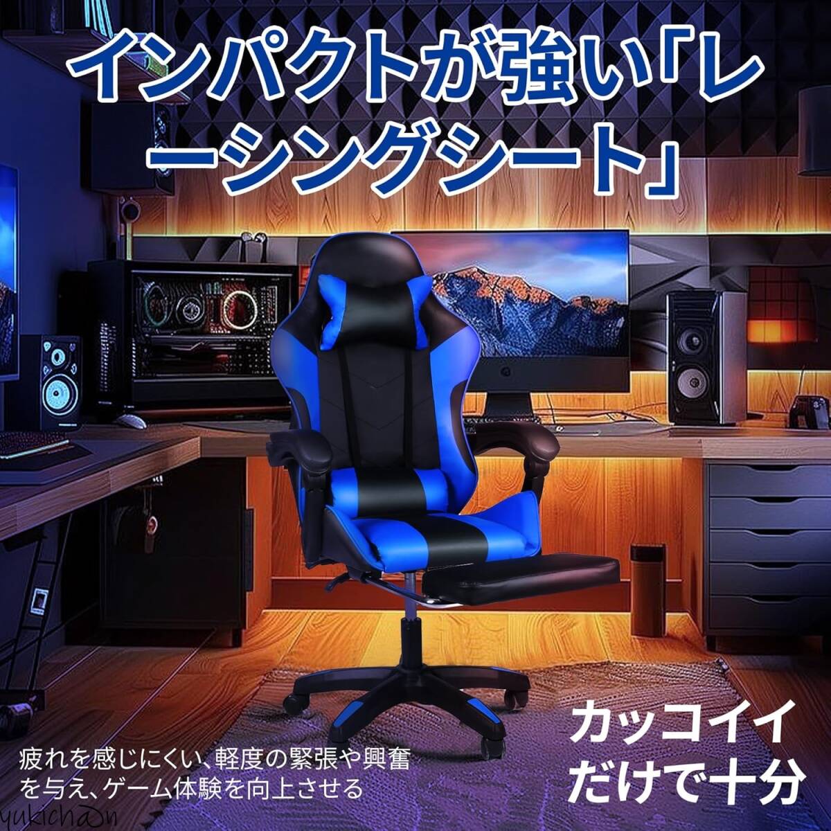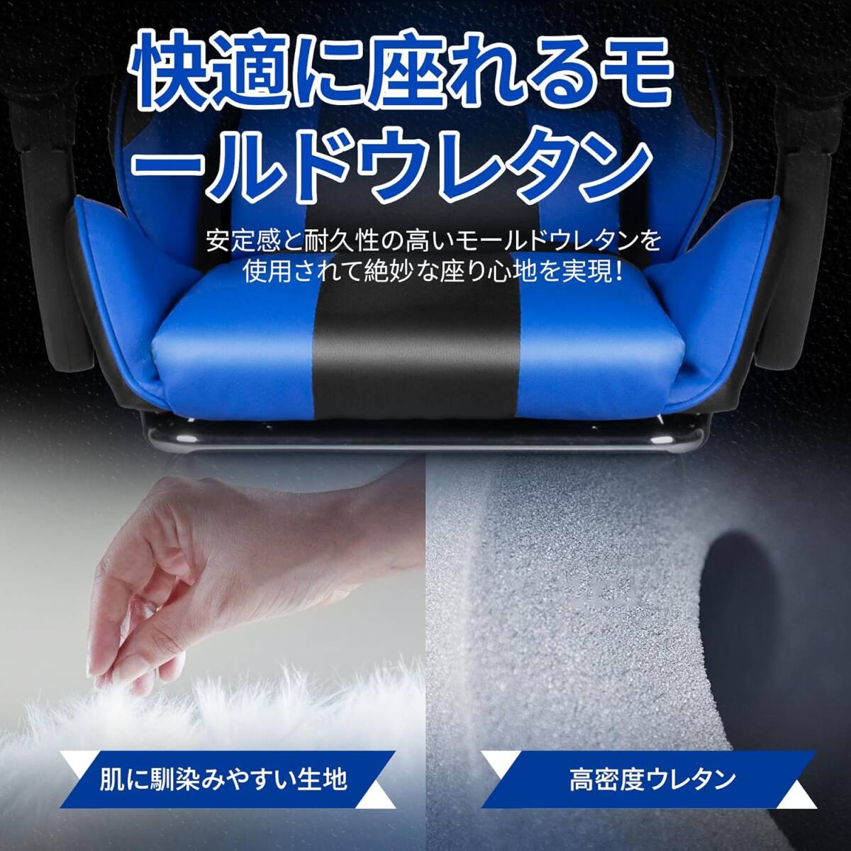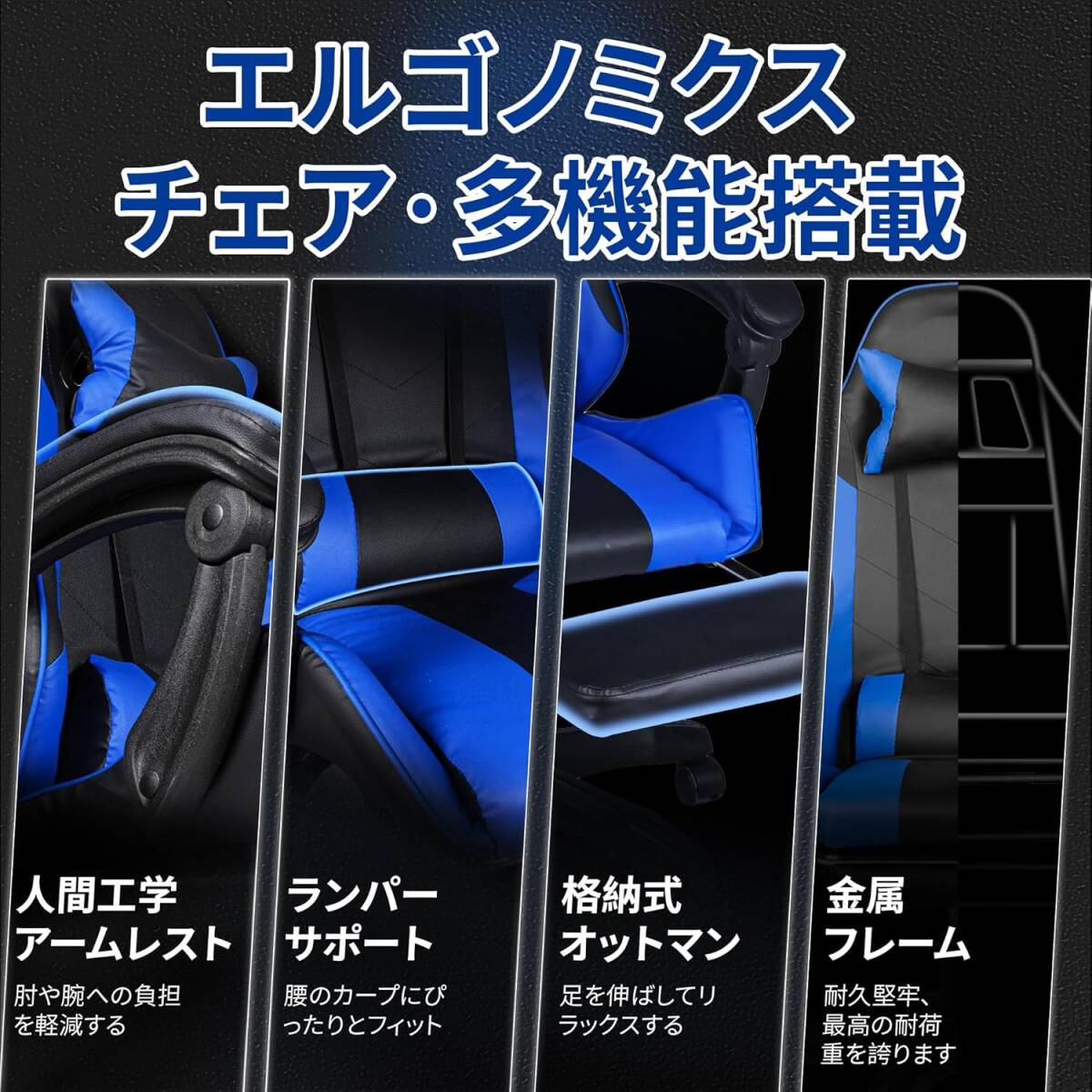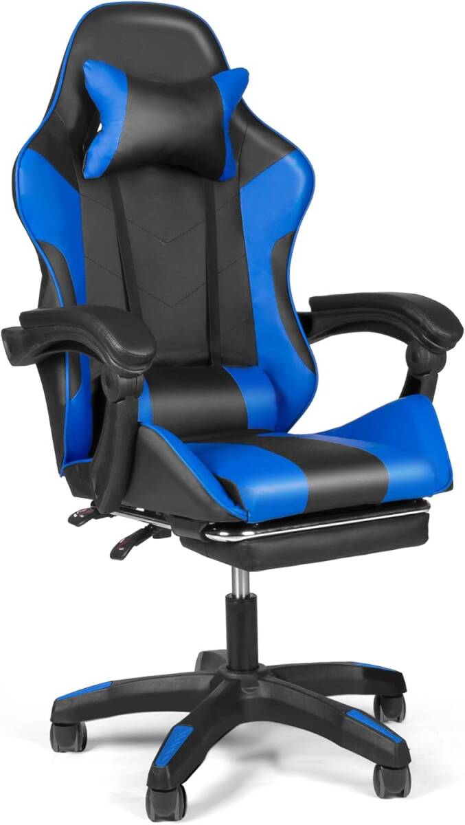 ゲーミングチェア オフィスチェア デスクチェア パソコンチェア ブルー オットマン付き 人間工学 165度リクライニング テレワーク椅子