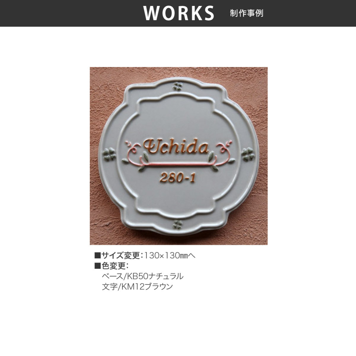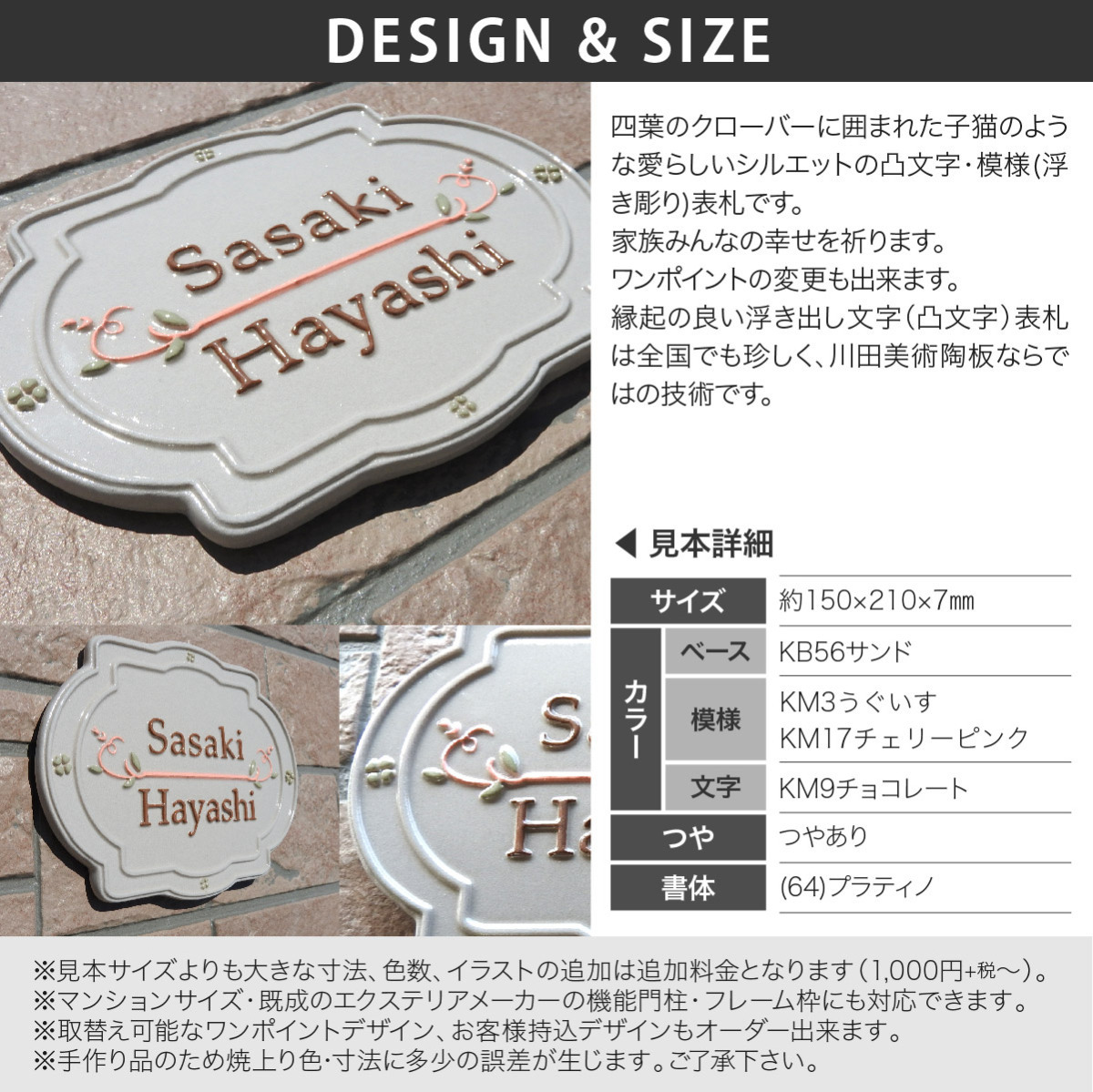 | 商品詳細 | 四葉のクローバーに囲まれた子猫のような愛らしいシルエットの凸文字・模様(浮き彫り)表札です。家族みんなの幸せを祈ります。ワンポイントの変更も出来ます。縁起の良い浮き出し文字(凸文字)表札は全国でも珍しく、川田美術陶板ならではの技術です。 |