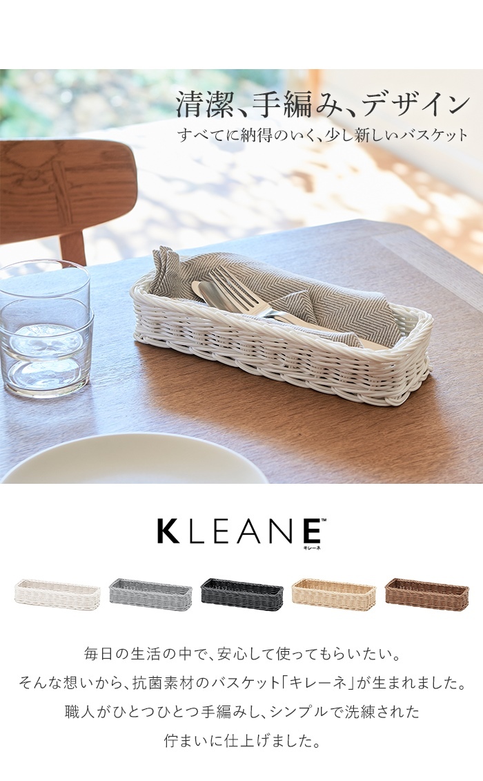| 見た目は籐のかごですが、実は抗菌樹脂製バスケット。 「抗菌性・安全性・適正な表示」を保障する「SIAAマーク」の表示が認められた、SIAA規格をクリアした抗菌素材(PP・PE配合)を使用、製品の表面上における細菌の増殖を抑制。 樹脂製なので、天然素材のようなささくれなどがなく、タオルや衣類なども炒める心配がないので、どんな収納にも最適。 紫外線にも強く、劣化も怒りにくく耐久性にも優れています。 水や湿気に強く、丸洗いできるので、水周りの収納やレジャーにもおすすめ。 汚れが気になっても手軽に水洗いできるので、いつでも清潔に保つことができます。 食洗機、電子レンジの使用も可能です。 ※ハンドメイトの商品の為、一つ一つ個体差があり表記サイズと異なる場合がございます。 |