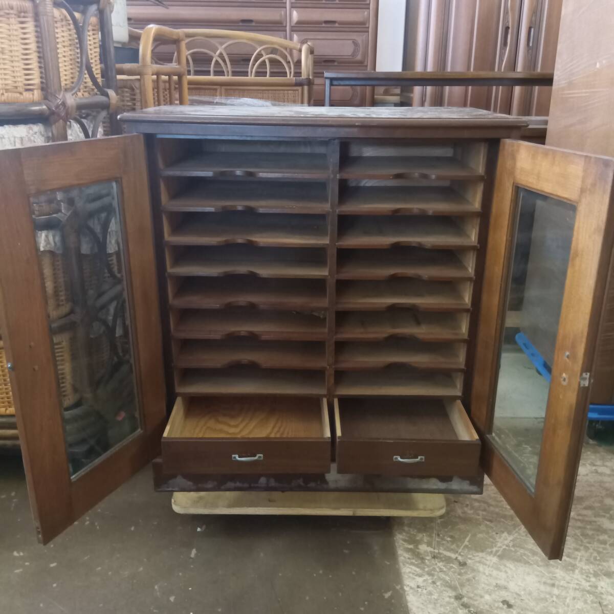 こちらは木製のアンティーク調レコードラックです。両開きのガラス扉の奥には多段式の収納棚があり、レコードコレクションを美しく整理できます。下部には引き出しも2杯付いており、針やアクセサリー、小物類の収納にも便利。