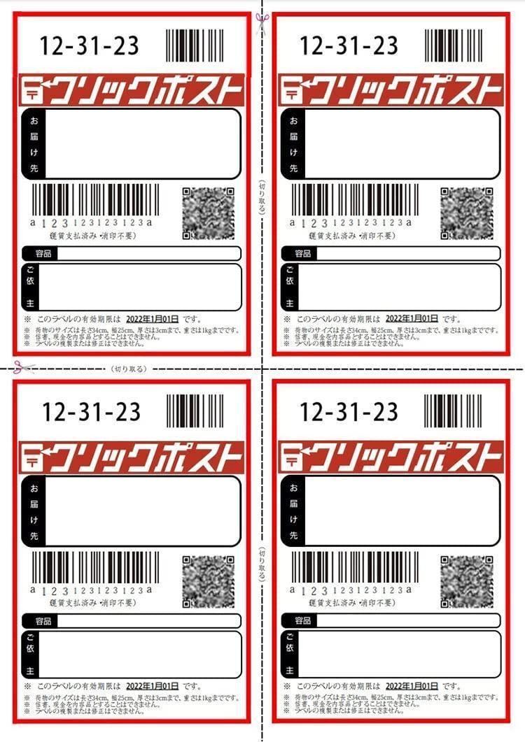 クリックポストの印刷に便利なA4サイズ 1/4カット ラベルシール。
