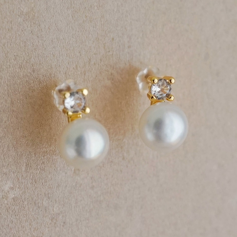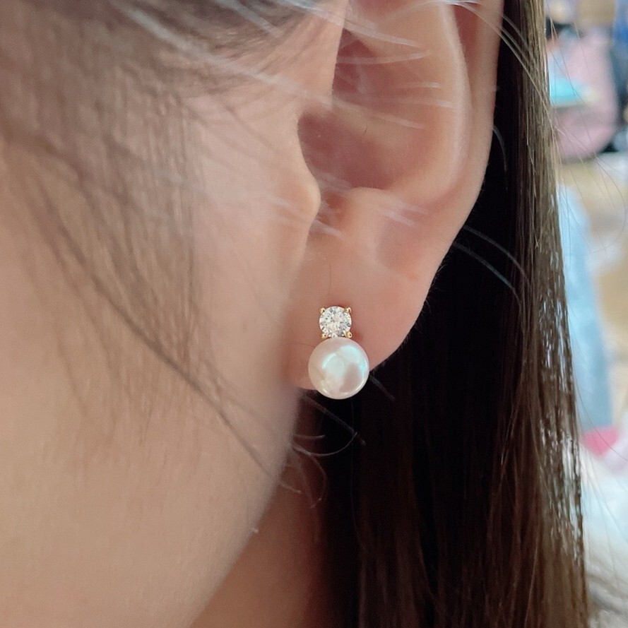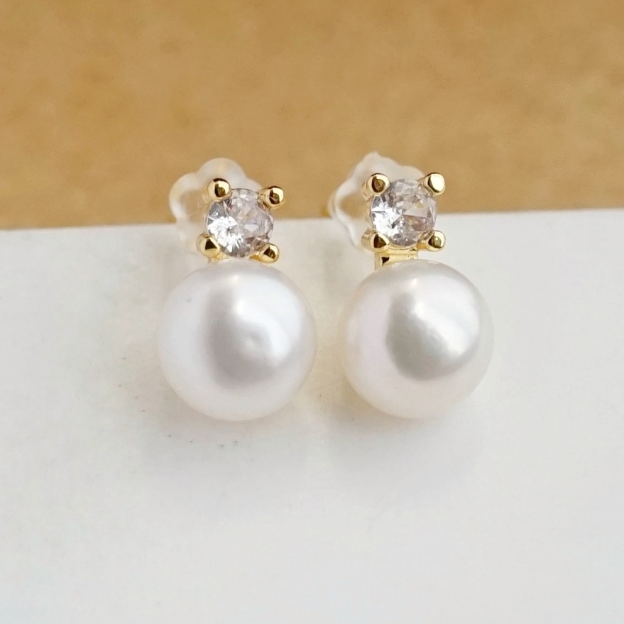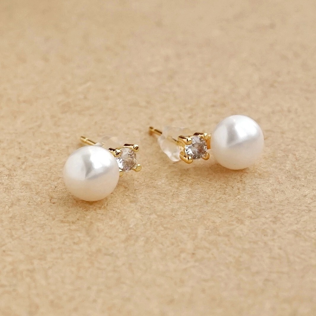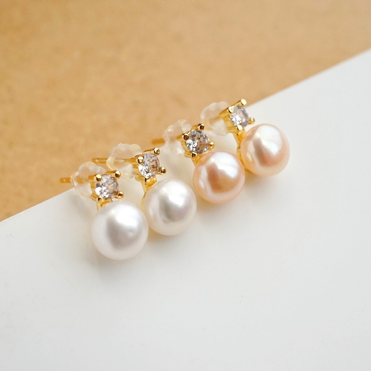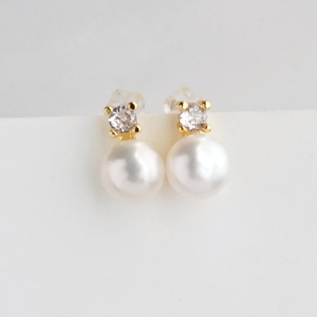 淡水パール:ボタン形直径約7mm-8mm キュービックジルコニア:直径約3mm   素材:フェイクパール、真鍮に厚いk18ゴールドコーティング(ニッケルフリー)、キュービックジルコニア