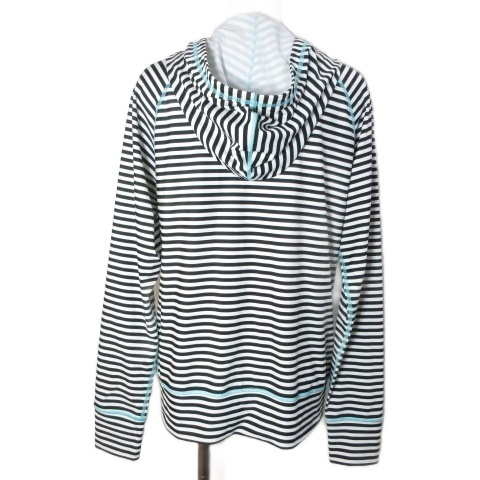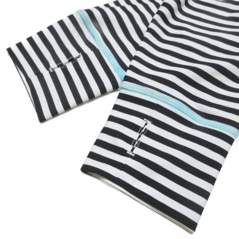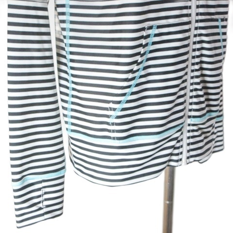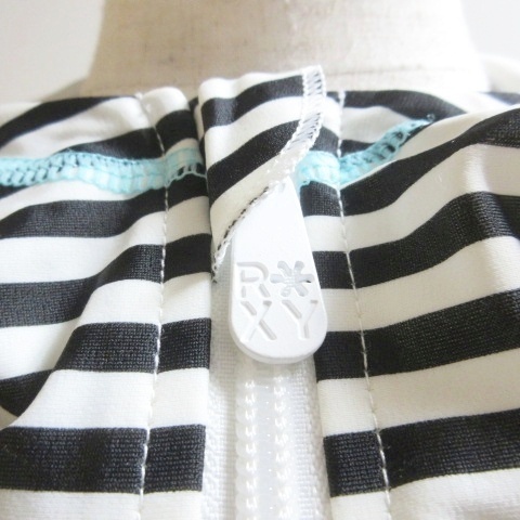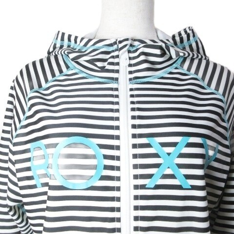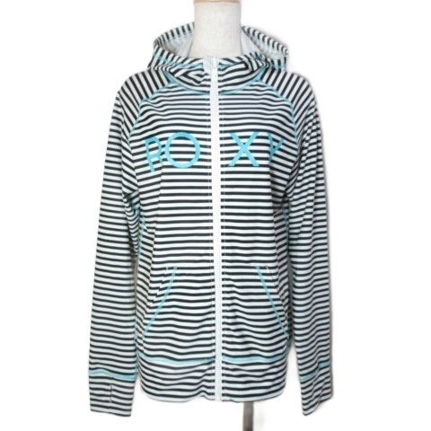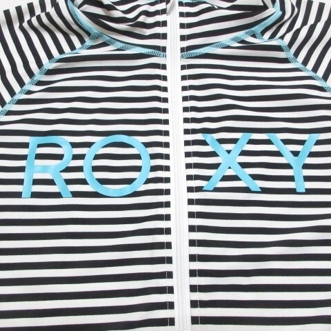 ロキシー ROXY 美品 ラッシュガード パーカー ジップアップ 長袖 ボーダー ロゴプリント ナイロンストレッチ サムホール L 黒 白 X
