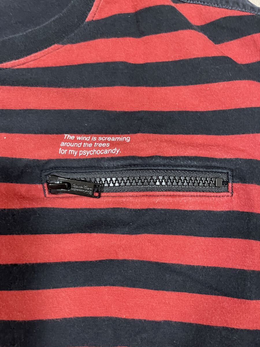 左胸にはThe Jesus and Mary Chainの楽曲「Psychocandy」の歌詞プリントとジップポケット、裾両脇にサイドポケット、ヨークの部分はシルクサテン切替、襟周りも通常のTシャツよりゆったりしており、Tシャツひとつにも細部のディティールまでこだわった、さすがアンダーカバーといった一着。