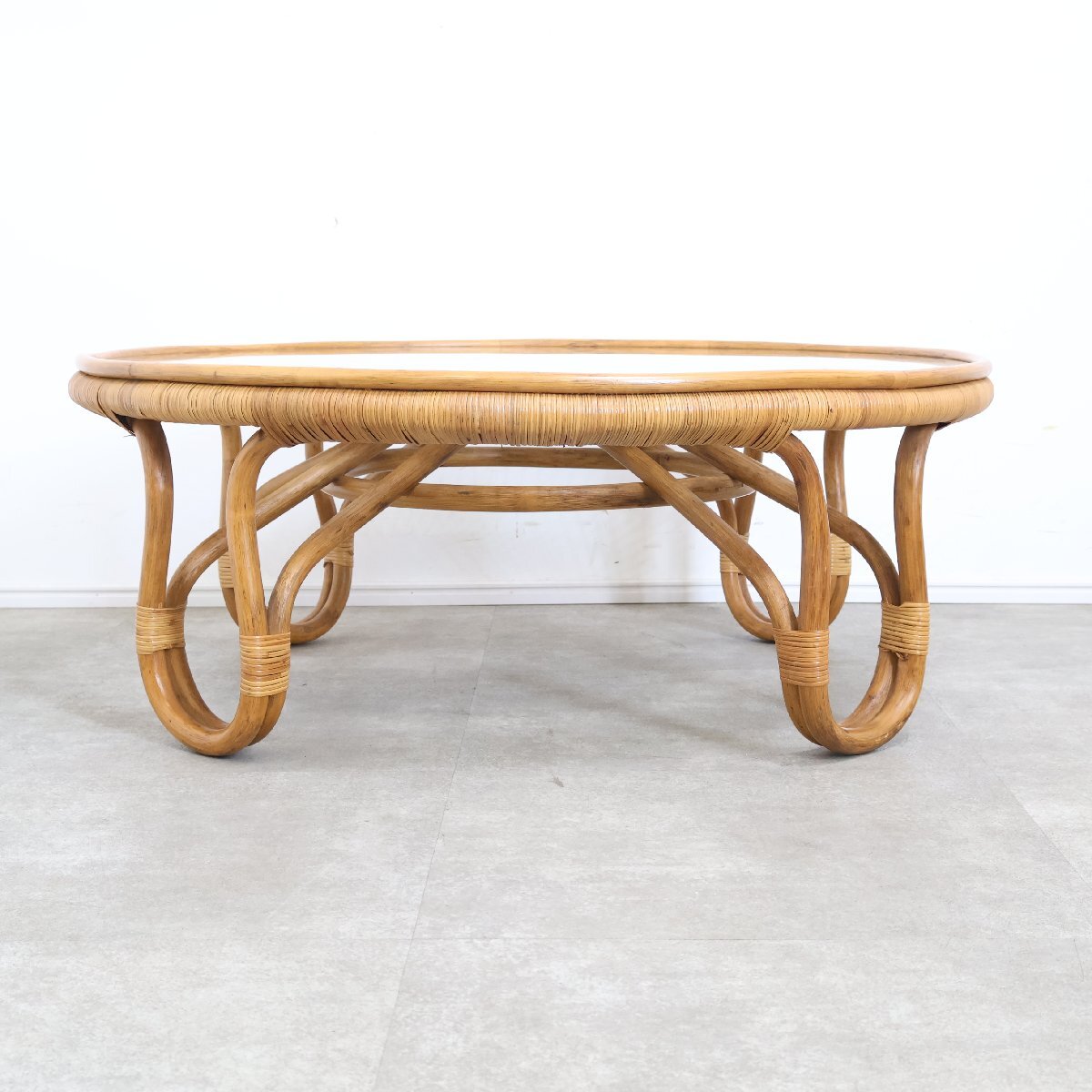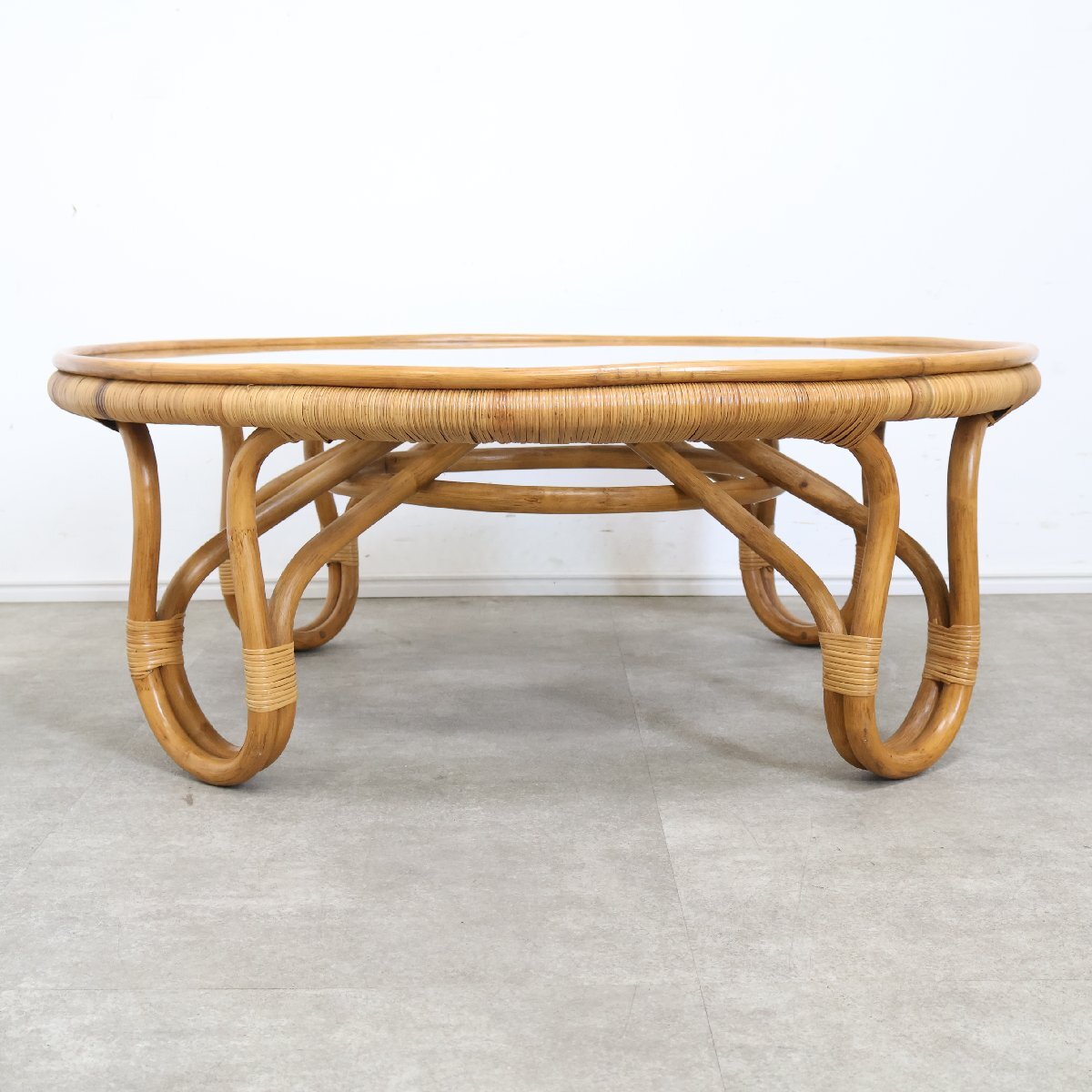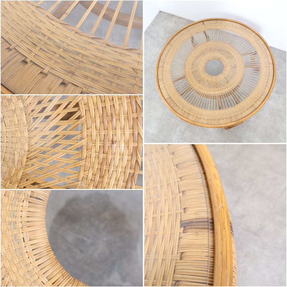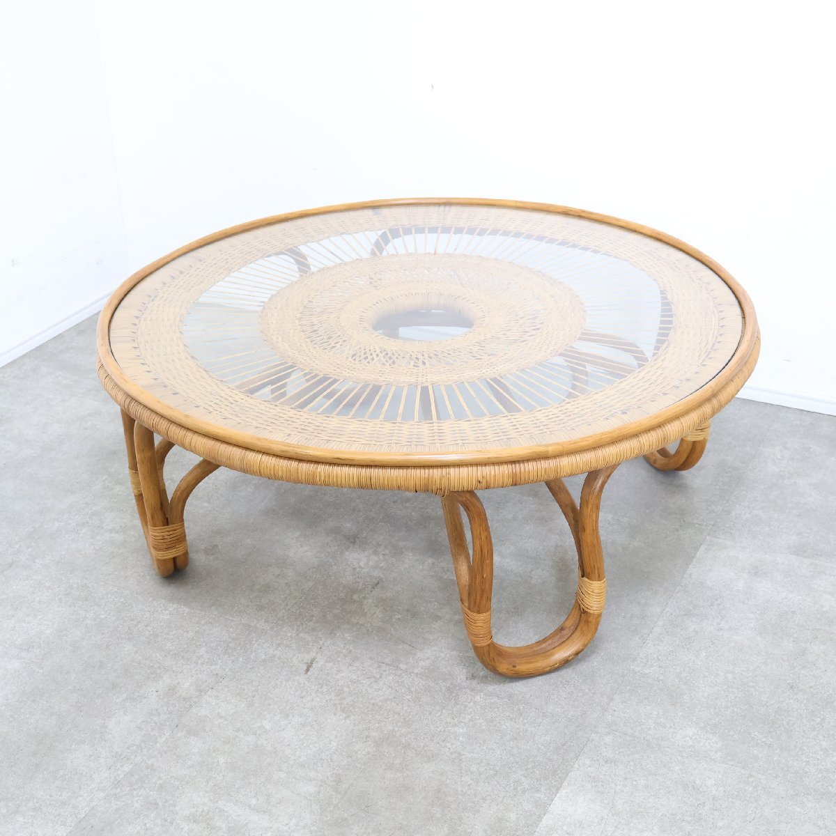 | 引取限定◆ラタン ガラステーブル ローテーブル センターテーブル アジアン 籐家具 ガラス天板 丸 昭和レトロ 古家具/9A2509004 |