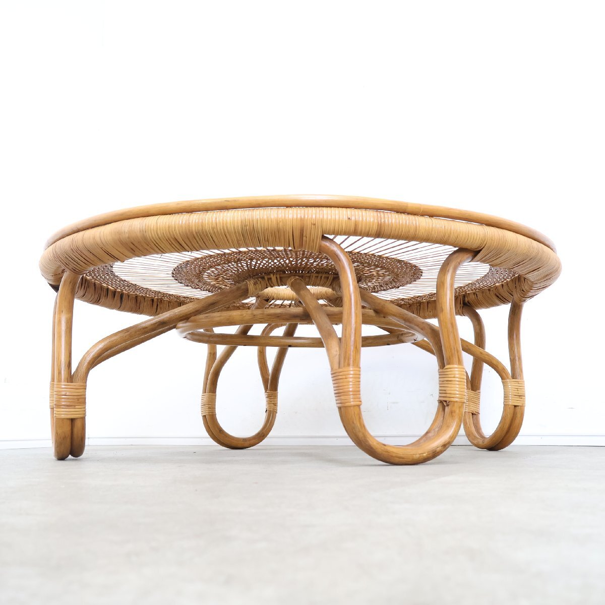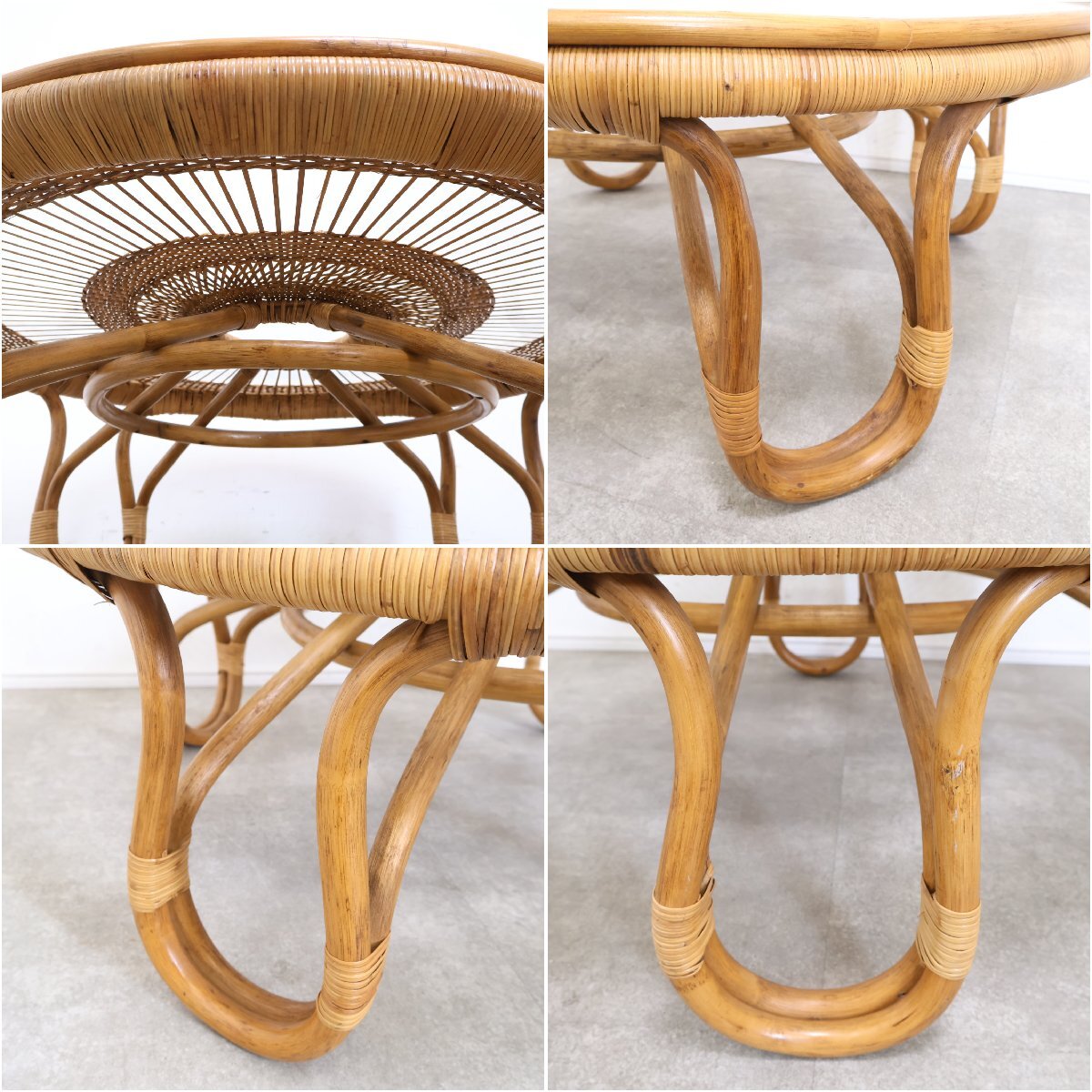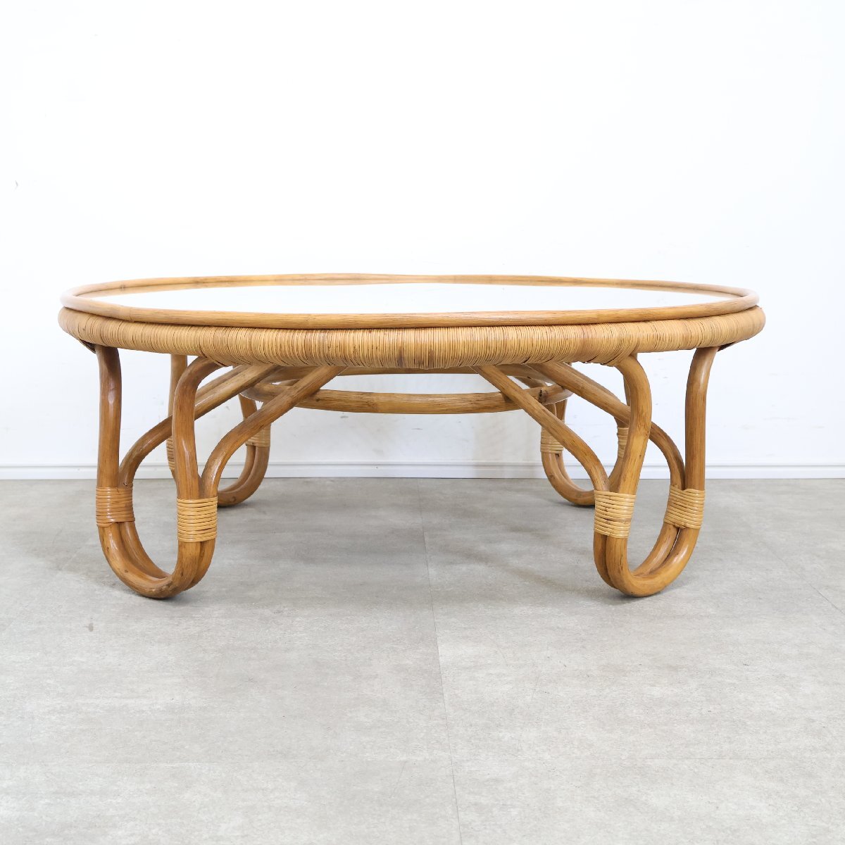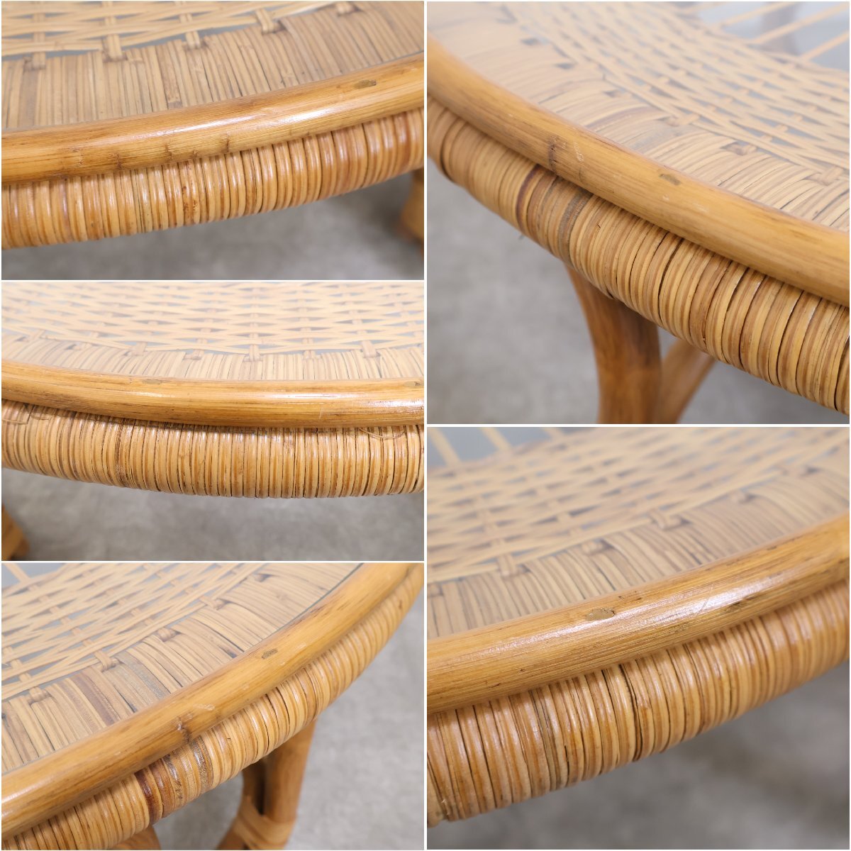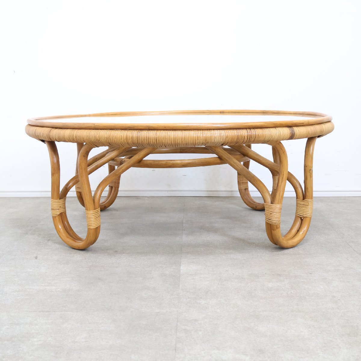 | 引取限定◆ラタン ガラステーブル ローテーブル センターテーブル アジアン 籐家具 ガラス天板 丸 昭和レトロ 古家具/9A2509004 |