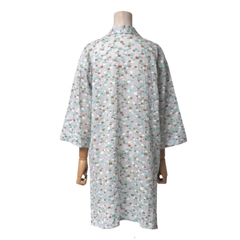 【表記サイズ】 表記なし ※弊社の私見となりますが、日本人のサイズ感ですと「M」程度かと思われます。 (※念の為、商品実寸をご参考下さい。) 【商品実寸】 着丈 :約85cm (後見頃・襟ぐり中央付け根から裾まで計測) 肩幅 :約48cm 身幅 :約53cm (脇下の端から端を計測) 袖丈 :約38cm |