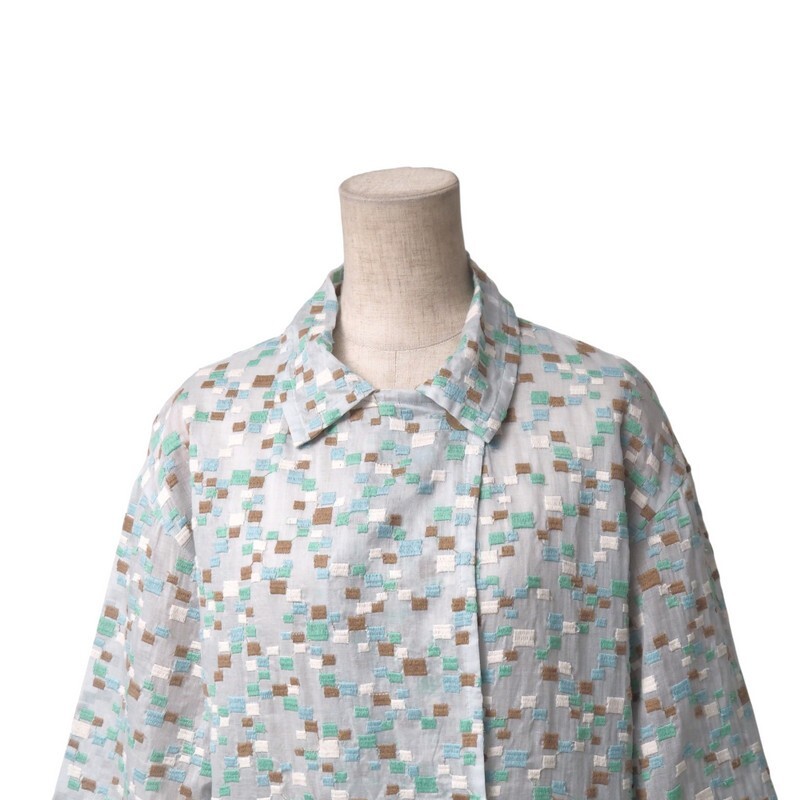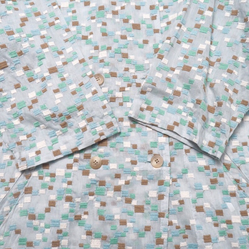 | TJ4025★plussyu プルッシュー 透け感 スクエア刺繍 ダブルブレスト 七分袖 コート ロングジャケット ブルーグレー系 M相当 日本製 | |||