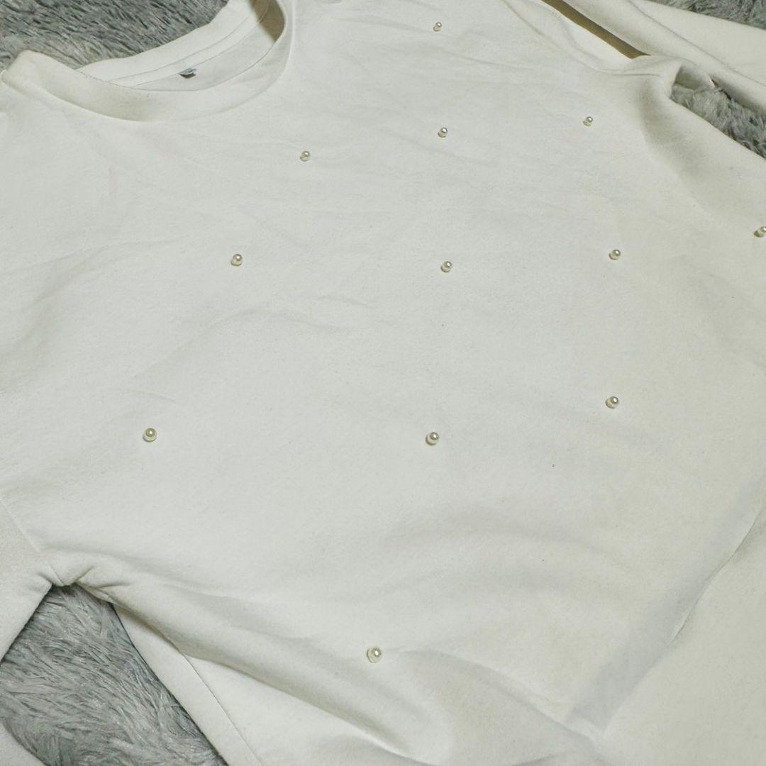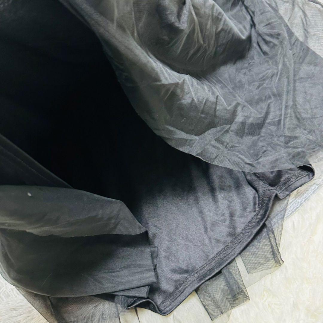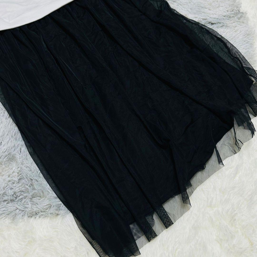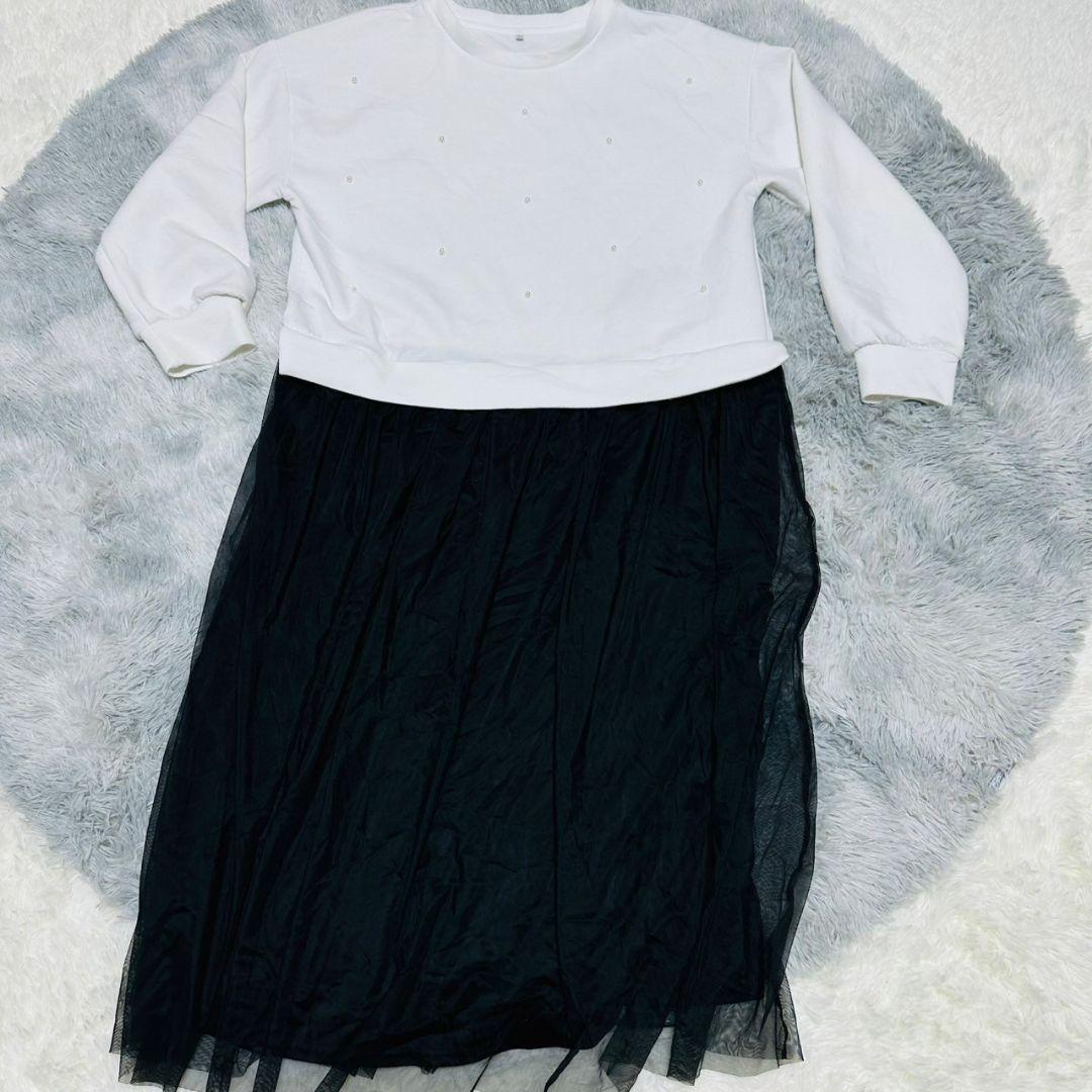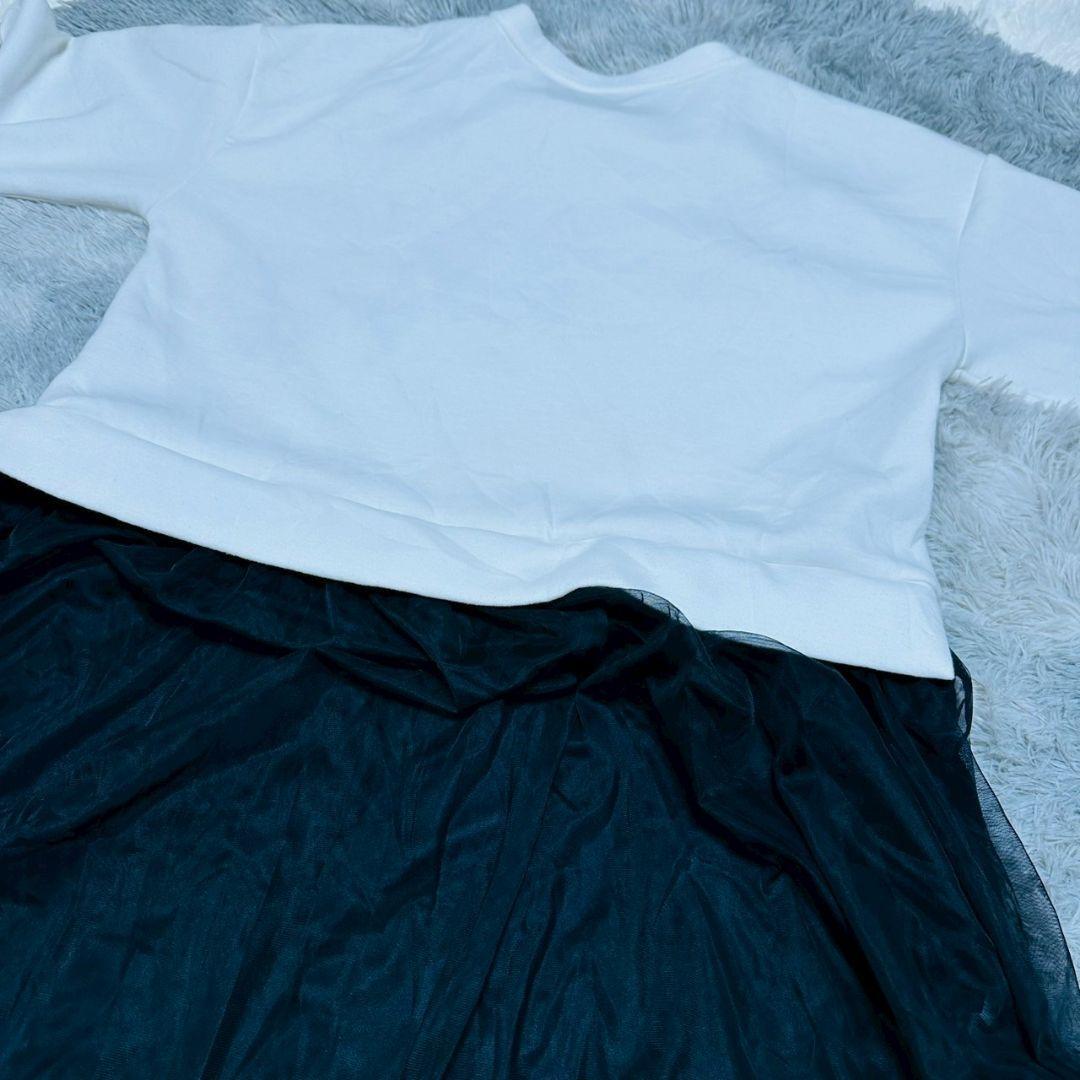ホワイトのスウェットトップとブラックのチュールスカートのレイヤードデザイン。