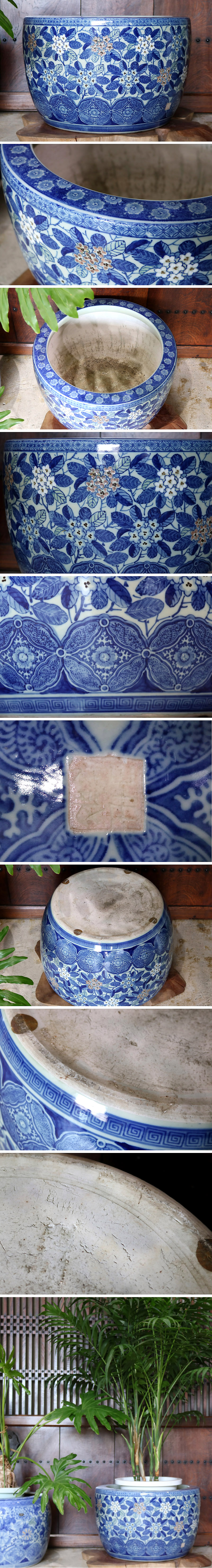 明治~大正時代 『山本製』 伊万里 染付白花紫陽花 七宝繋ぎ文 総柄火鉢 観葉植物鉢カバー 植木鉢 メダカ鉢、金魚鉢、睡蓮鉢 瀬戸 S9