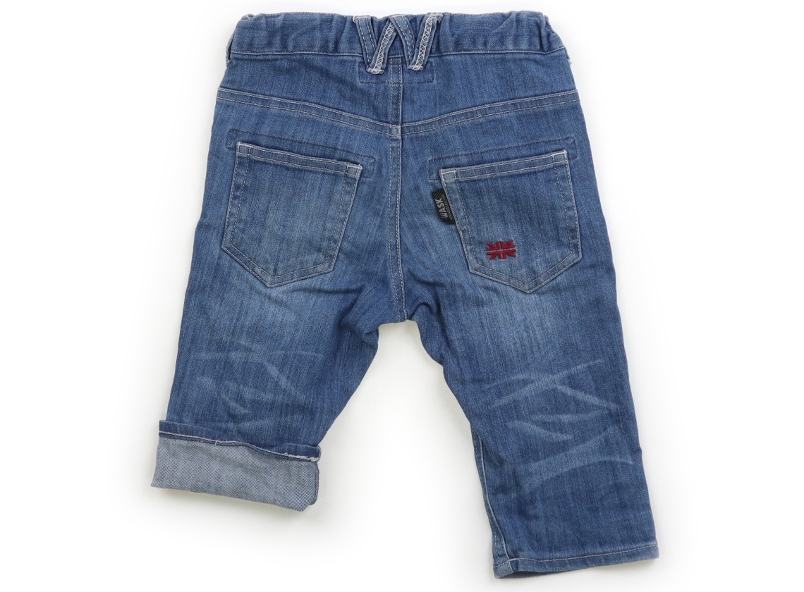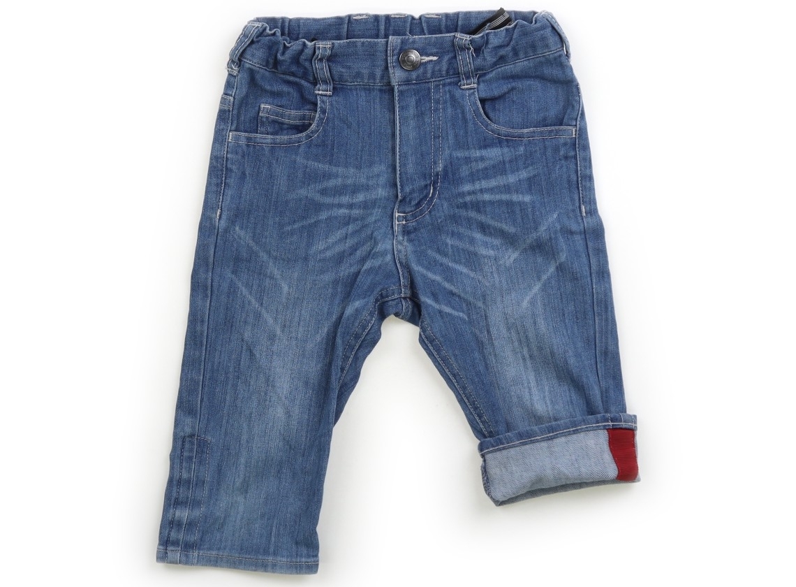 前ホック、ファスナー。ウエストはサイズ調整ゴムが付いています。股下、約24cm。元々のデザインもありますが、色あせやダメージあり。洗いざらし感ありますが、まだまだ普段着として活躍してくれそうです。