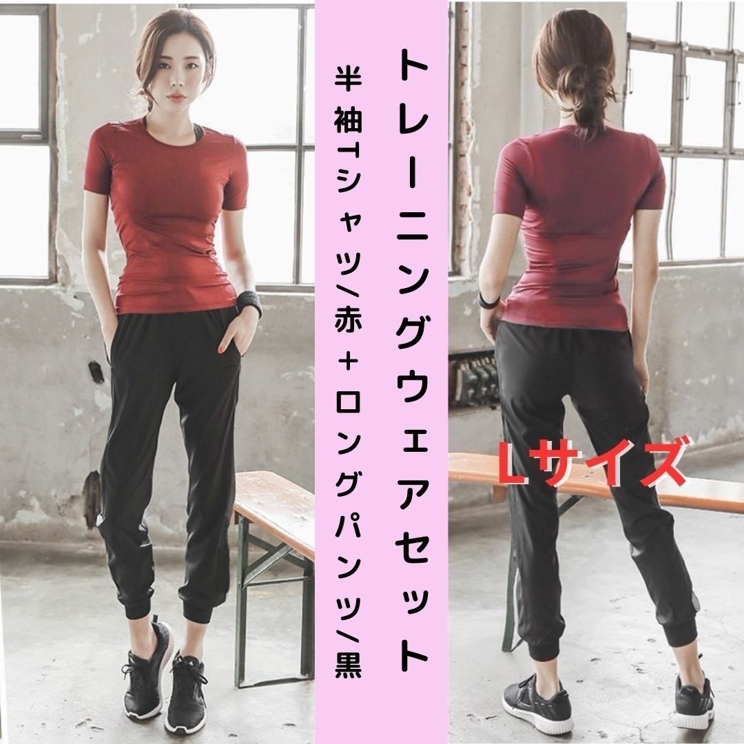 ベーシックなデザインのレディースのトレーニング半袖Tシャツ(赤)+ロングパンツ(黒)のセットアップ