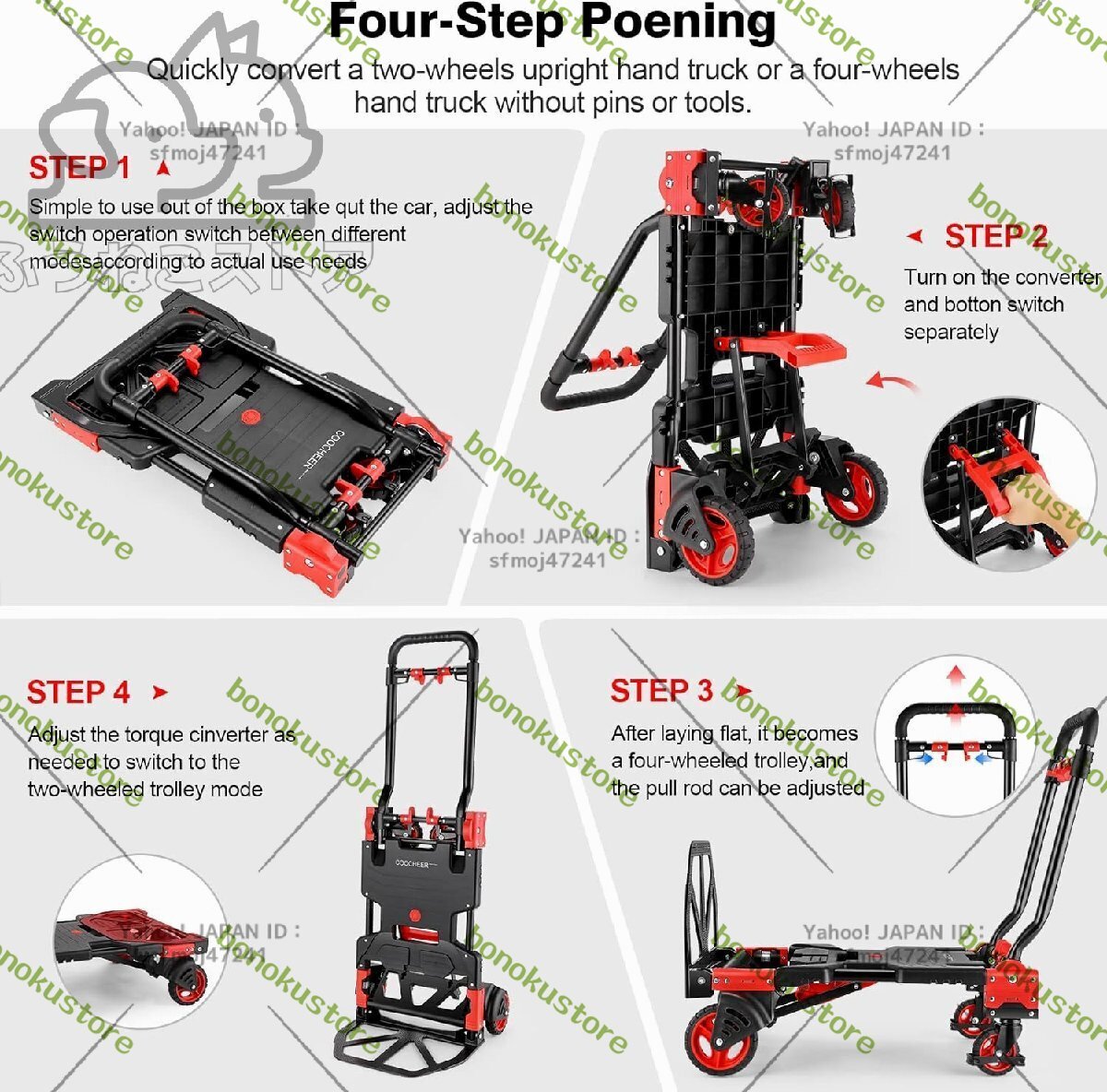 【持ち運びが容易】素早い変換、ピンや工具は不要で、わずか数秒で2輪ハンドトラックたは4輪フラットカート切り替えられます。折りたたみ時の寸法が 63×45×12 cm、重量が約 8 kg なので、ほとんどのサイズの車のトランクに適しています。
