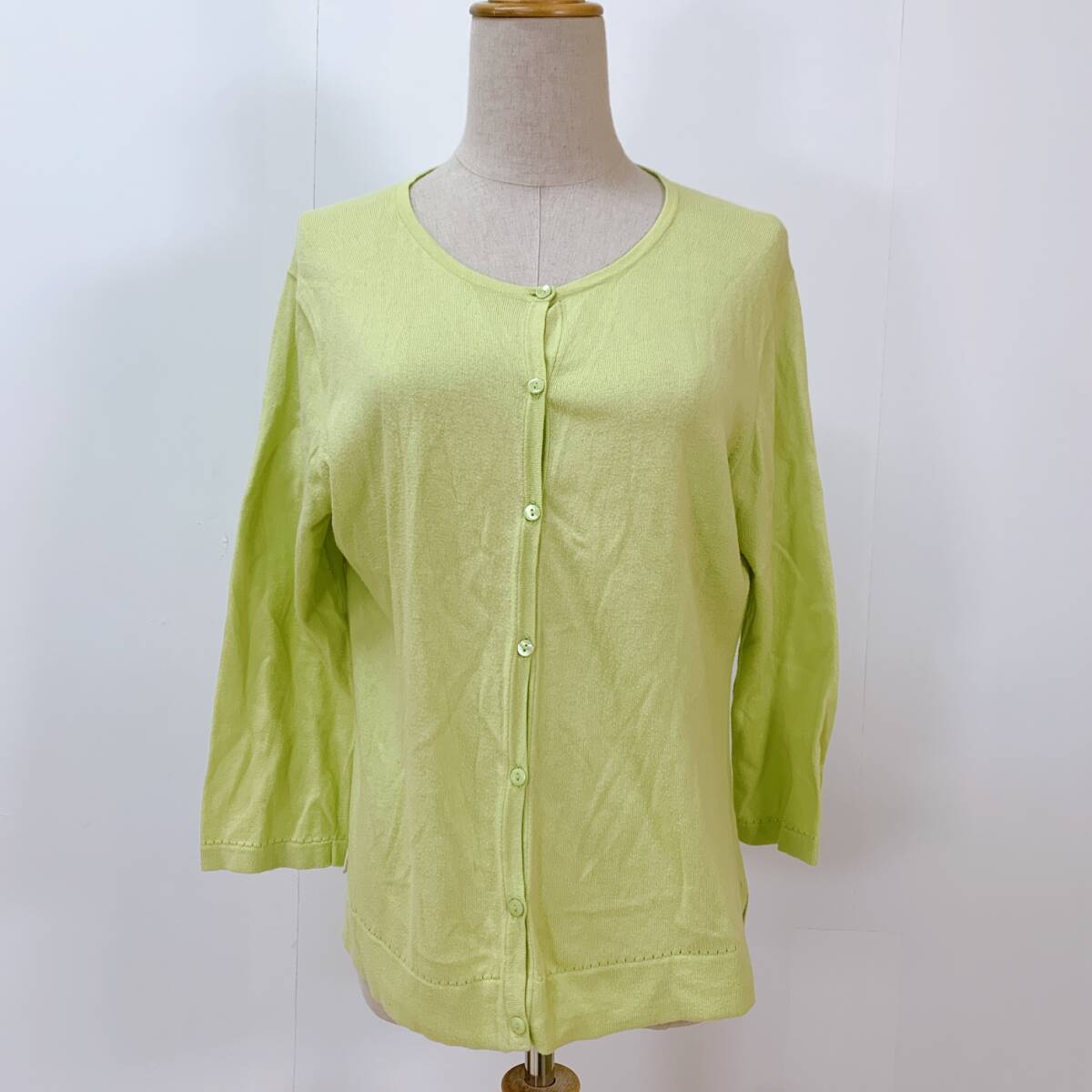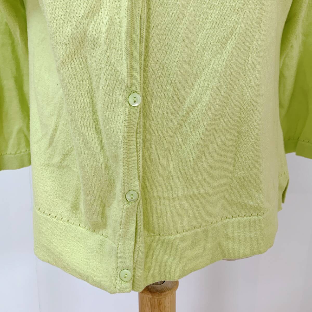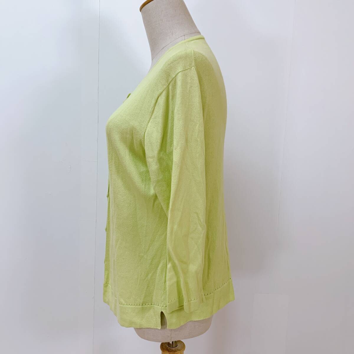 YH1617 レディース イタリア製素材使用 長袖 カーディガン サイドスリット 袖裾リブ 薄手 LLサイズ グリーン 黄緑 お洒落 万能 USED 古着