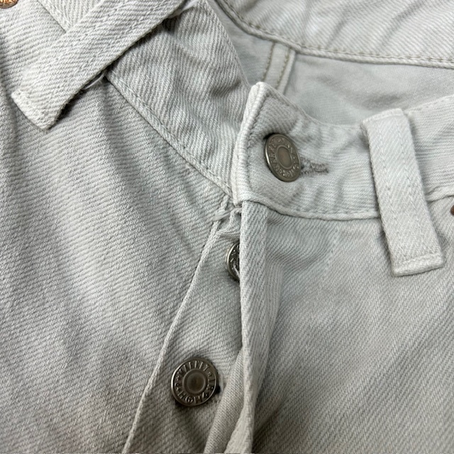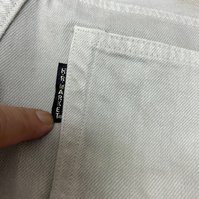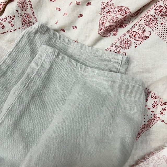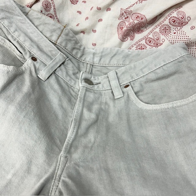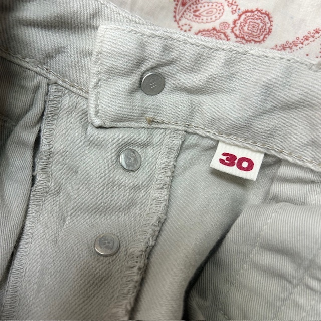 ●商品説明・・・2000年代頃のハリウッドランチマーケットのフェードしたような薄いグレージュのような色合いのデニムパンツです。ボタンフライでストレートシルエットです。やや股上浅め(ややローライズ)な作りです。日本製で、素材はコットンです。サイズ表記は30で、おそらくメンズ(S程度)かと思いますが、もしかするとレディースかもしれないです。シルエット的にはメンズライクでユニセックスで履いていただける感じです。